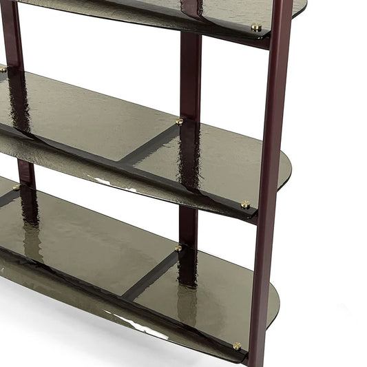 PETRA RED METAL BOOKCASE WITH CURVED BRONZE GLASS SHELVES | $12,090.00