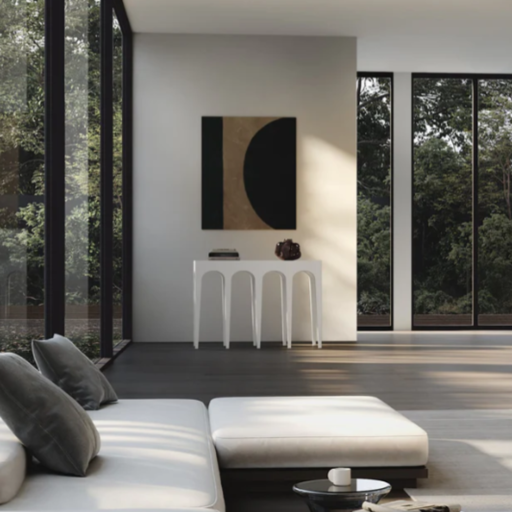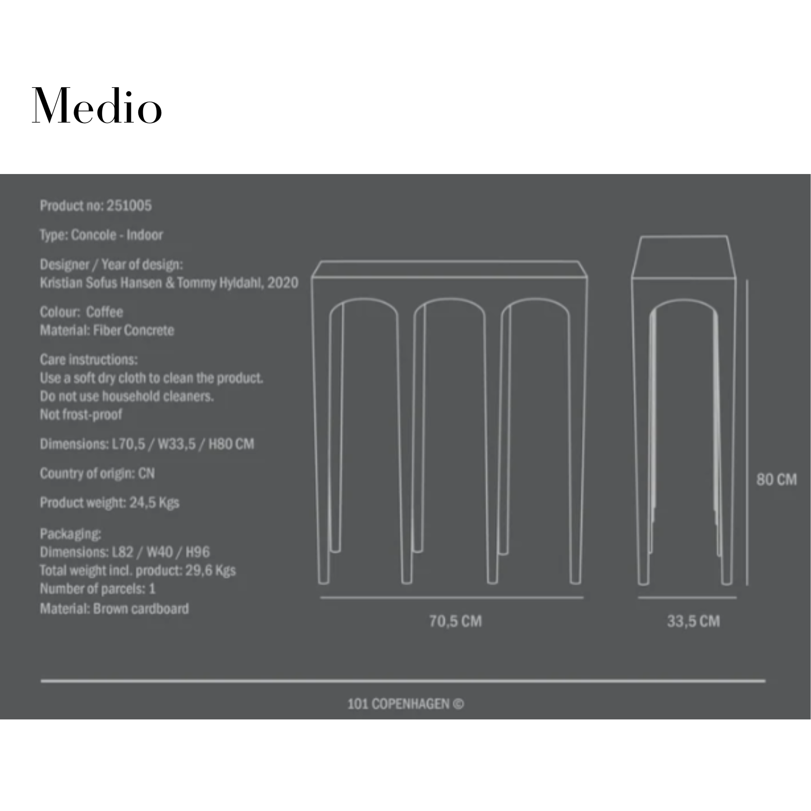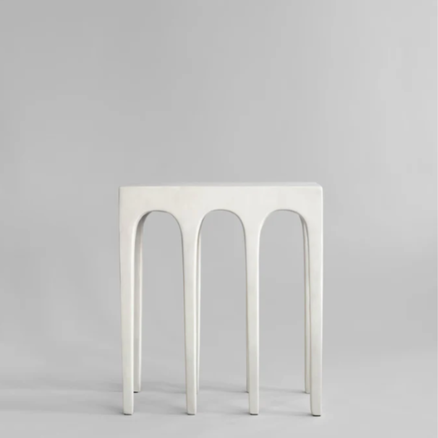 Like a piece of architecture gone astray, the Bow console table draws parallels to the old aqueducts from the Roman Empire and classic architectural geometry. Repetition of arches create a beautiful, sleek, yet somewhat box silhouette and the long legs make it seem narrow and light even though the character is anything but insignificant. The table is cast in lightweight fiber concrete to create a unique textured surface and increase mobility. It is hand painted with multiple layers of paint, creating a strong and resistant surface.
