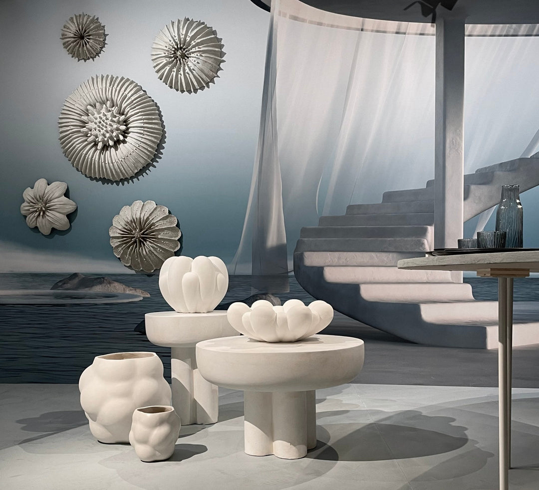 The collection of tables entitled Crown are cast in one piece formed as a circular table top carried by four cylinder shaped legs. Standing strong and proud, the table is inspired by the bare, structural elements of Brutalist architecture, celebrating the columns, and eluding an attitude towards too many details. The chunky fiber concrete legs enable a large gap between the table edge and legs to emphasize the experience of a massive floating table top. The table is available in two sizes and can be used as a single standing side table or stand together as a pair of coffee tables.