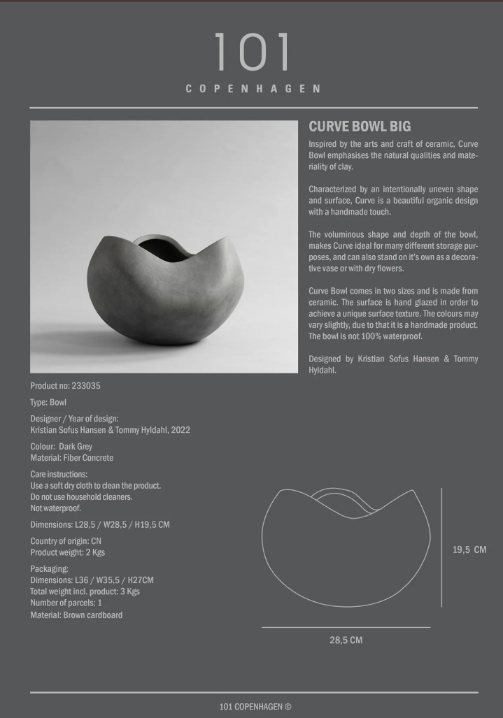 The voluminous shape and depth of the bowl, makes Curve ideal for many different storage purposes, and can also stand on it’s own as a decorative vase or with dry flowers.