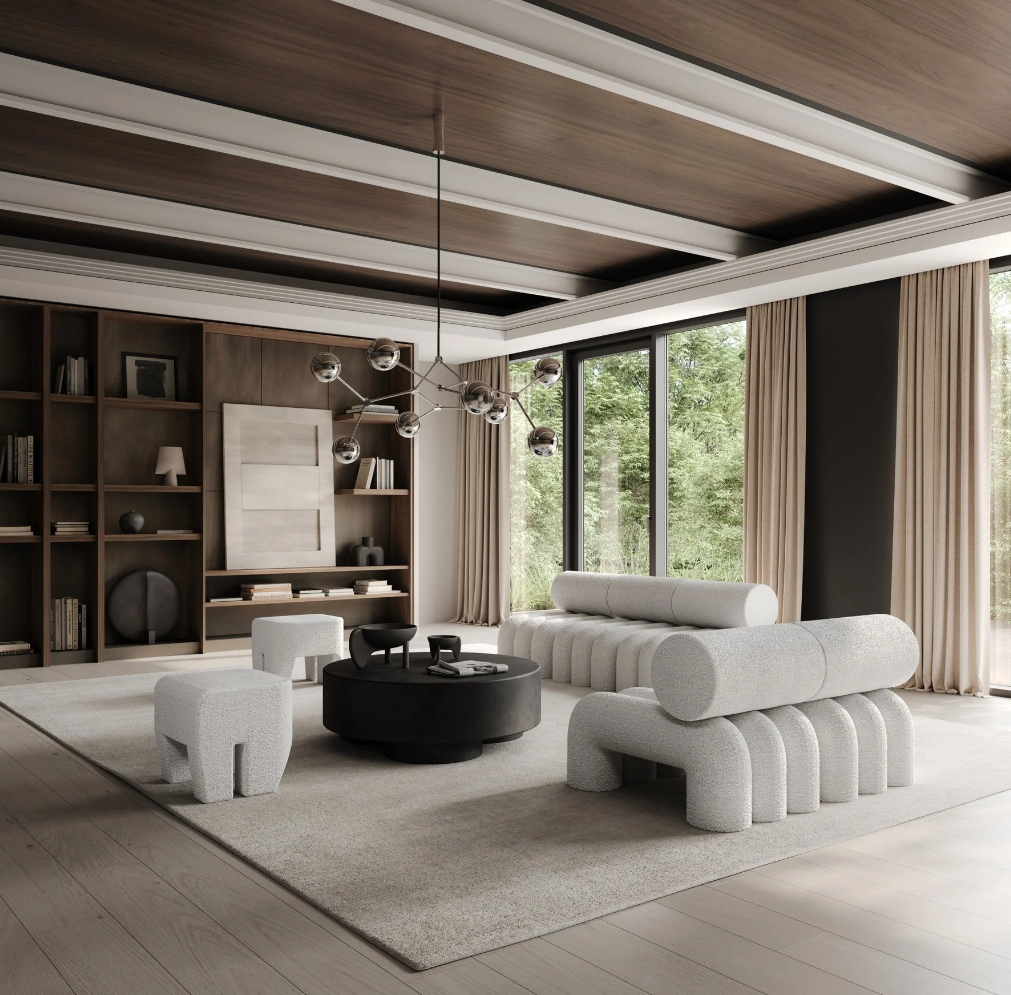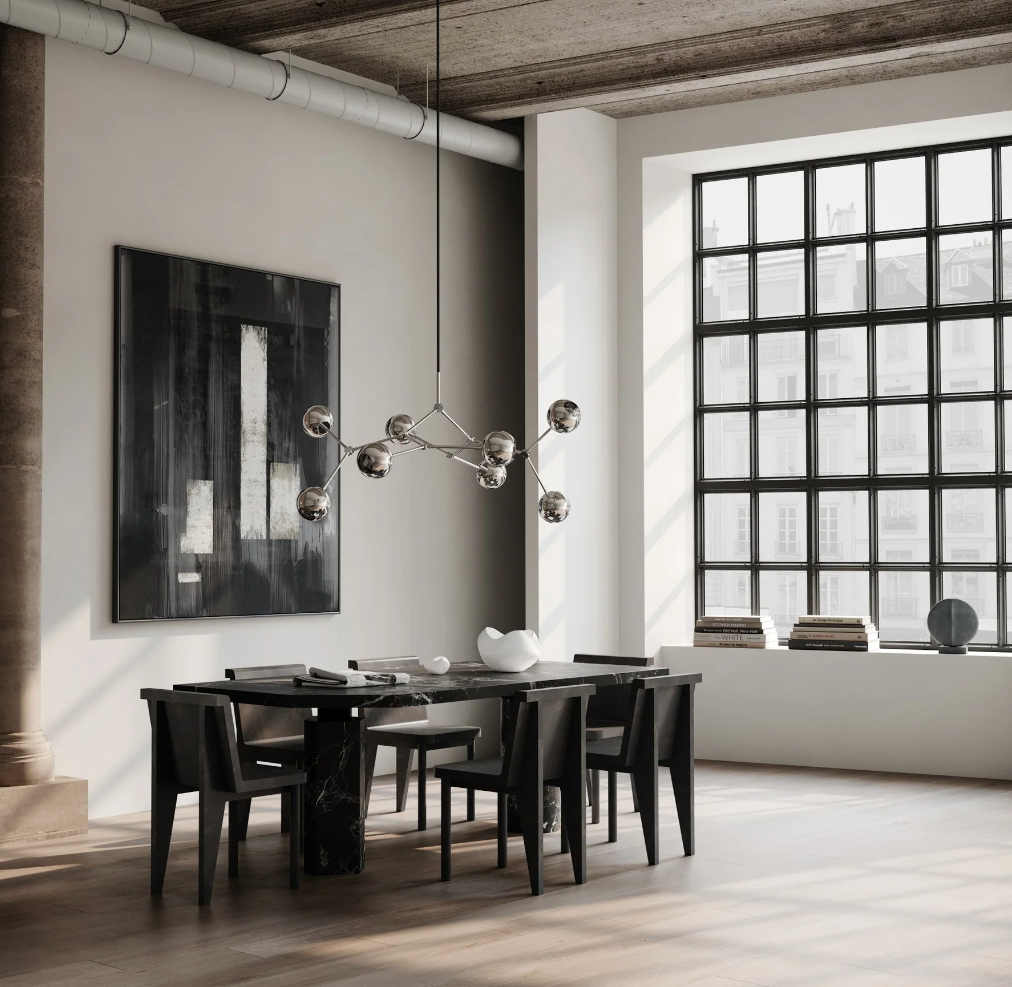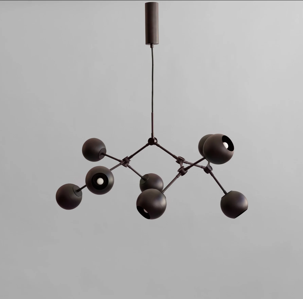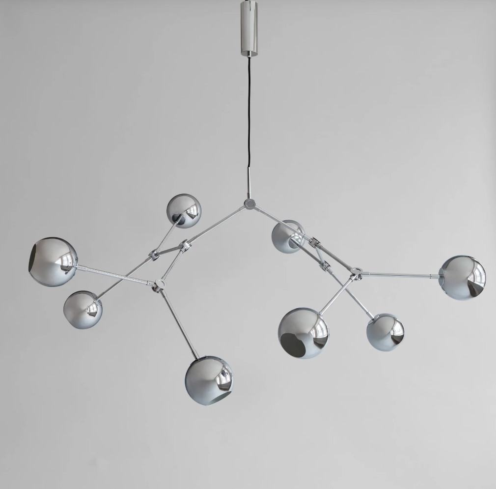 The Drop Chandelier Globe introduces a captivating twist to its iconic design with the introduction of a sleek, globe-shaped metal lampshade. Named after its lampshade, Drop Chandelier Globe is an ode to 80’s geometric designs, emphasizing clean lines and effortlessly melds with any interior decor.