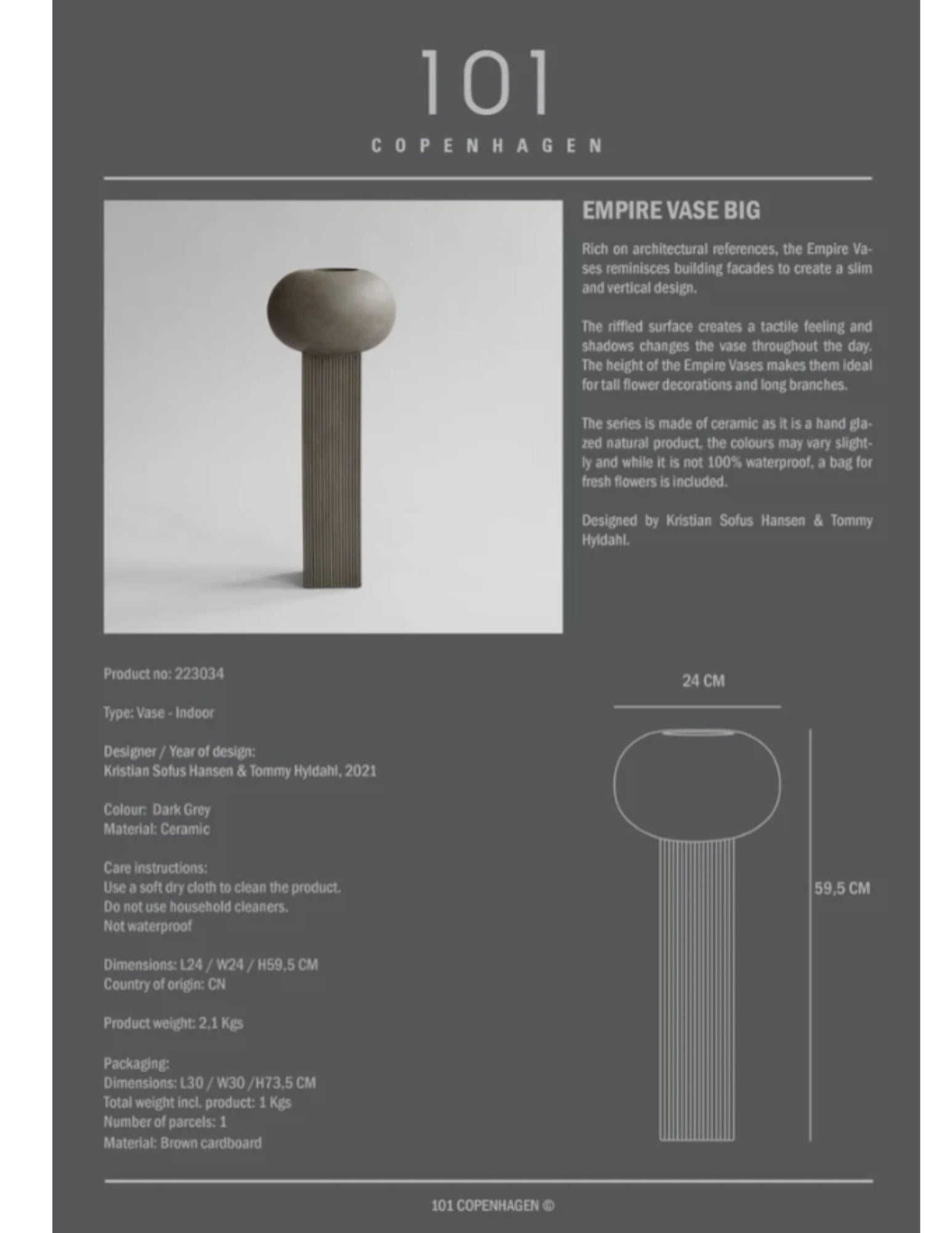 Rich on architectural references, the Empire Vases reminisces building facades to create a slim and vertical design. The riffled surface creates a tactile feeling and shadows changes the vase throughout the day. The height of the Empire Vases makes them ideal for tall flower decorations and long branches. The series is made of ceramic as it is a hand glazed natural product, the colours may vary slightly and while it is not 100% waterproof, a bag for fresh flowers is included.