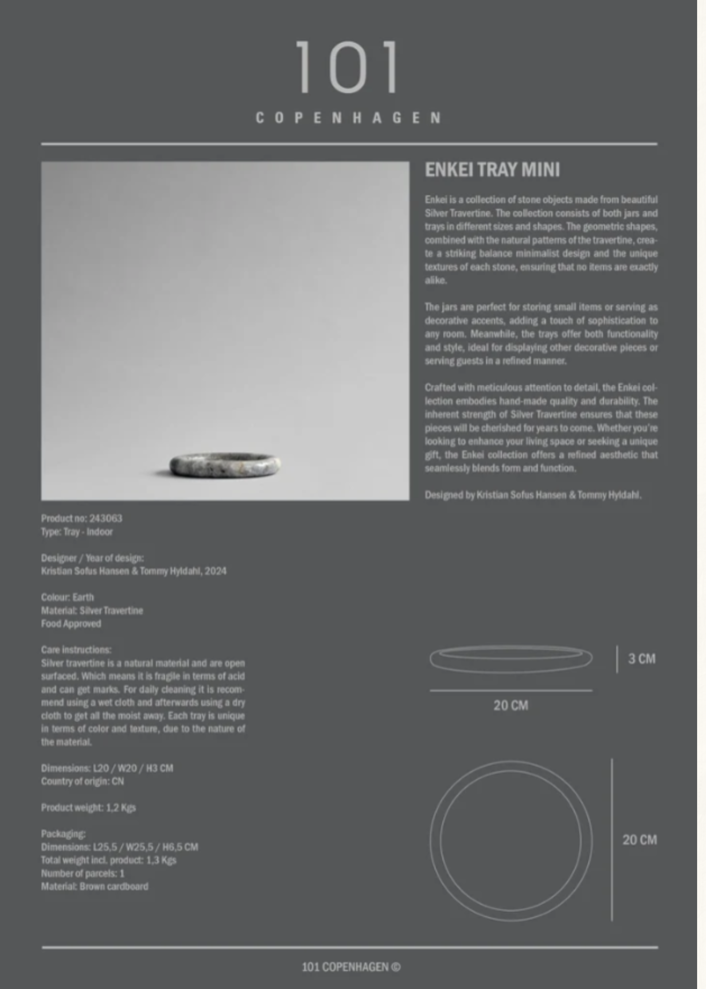 The Enkei collection features stone jars and trays made from Silver Travertine, known for its natural beauty and unique patterns. Each piece showcases minimalist geometric shapes, enhanced by the distinct textures of the stone, ensuring no two items are the same. The jars offer elegant storage solutions or decorative accents, while the trays combine functionality with style for display or serving purposes. With hand-crafted attention to detail, the collection emphasizes both quality and durability. Enkei provides a refined aesthetic that balances form and function, making it a timeless addition to any space or a thoughtful gift.