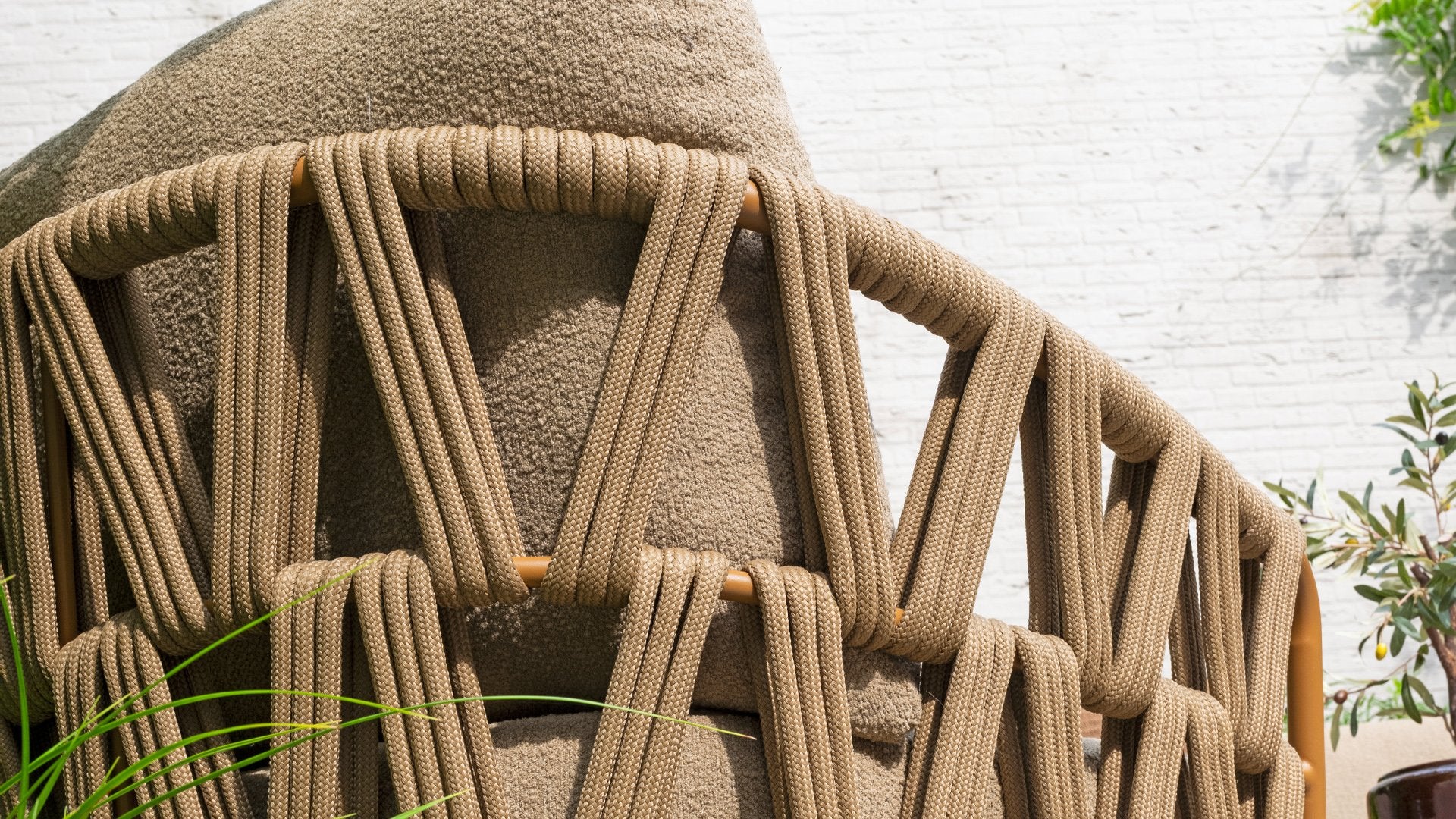 The sturdy frame is crafted from powder-coated aluminum in a warm earth tone, combined with strikingly thick rope wickerwork. This artisanal finish gives the Biarritz series a robust yet refined appearance. The spacious seats, plump cushions, and soft textures make this lounge a luxurious place to spend long summer days.