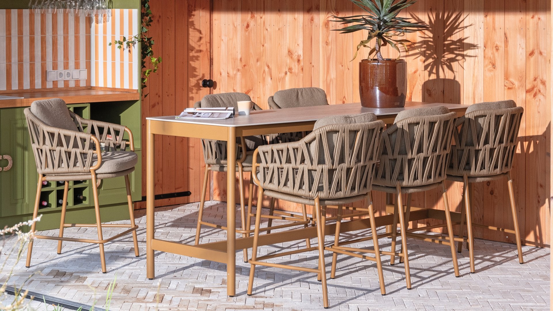 The 4 Seasons Outdoor Biarritz Amber High Dining set is a perfect choice if you're looking for something between a bar chair and a garden chair. With its generously woven rope details in a deep amber color and the richly filled cushions in a soft, amber bouclé fabric, this set invites you to relax in your garden or on your patio.
