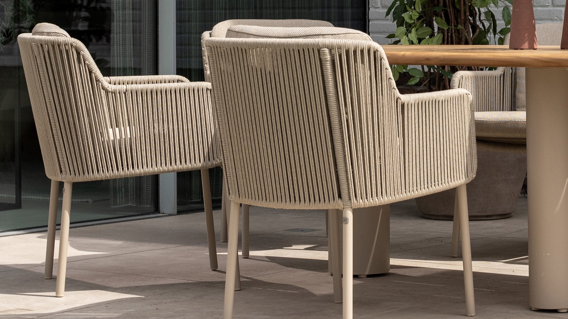 With their round shapes and subdued Terre/Latte color, the Bernini chairs are easy to combine with various 4SO tables. The round seat with hand-woven rope provides fantastic comfort. The thick cushions are made of rich bouclé fabric, allowing you to enjoy the outdoor life for hours on end.