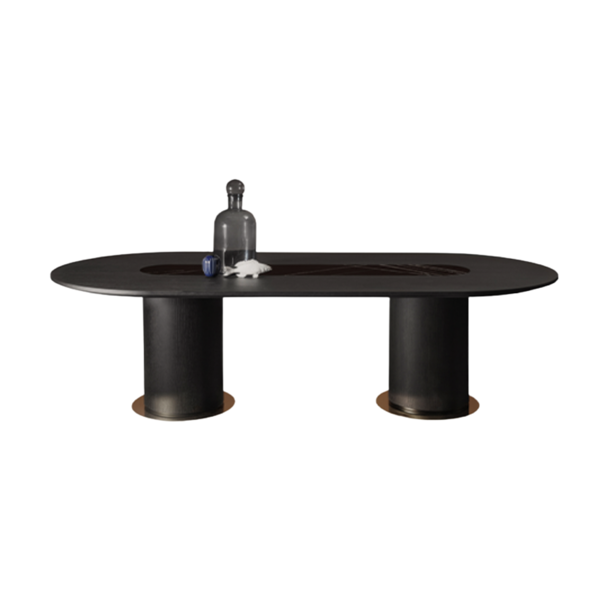 Technical features Feet: multilayer tubular veneered with oak dyed umbra grey with base plate in polished brass Top: external side in MDF veneered with oak dyed umbra grey or marbles. Inner side in MDF veneered with oak dyed umbra grey or marbles.