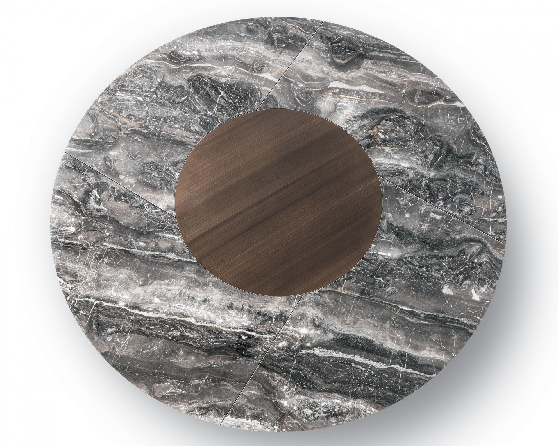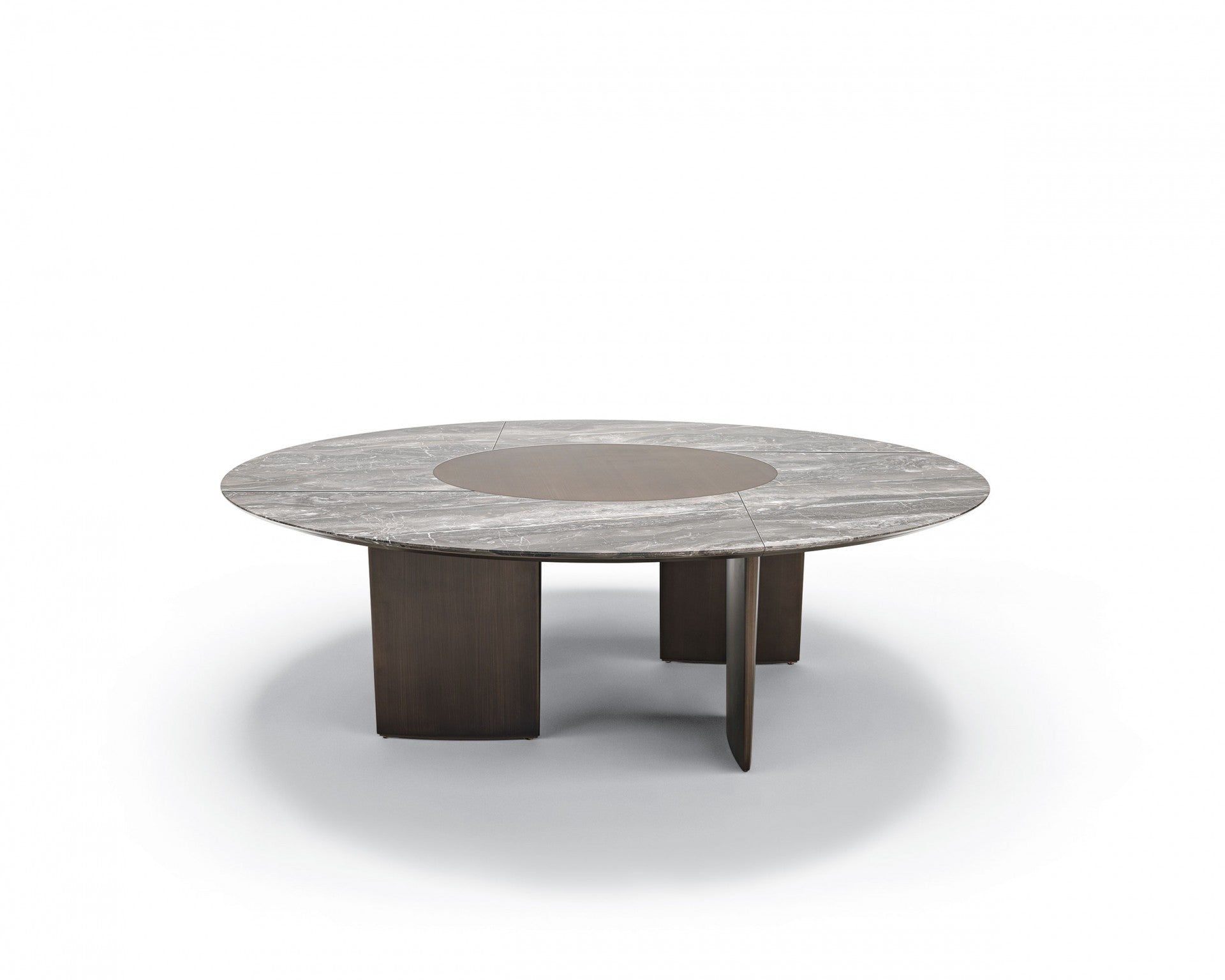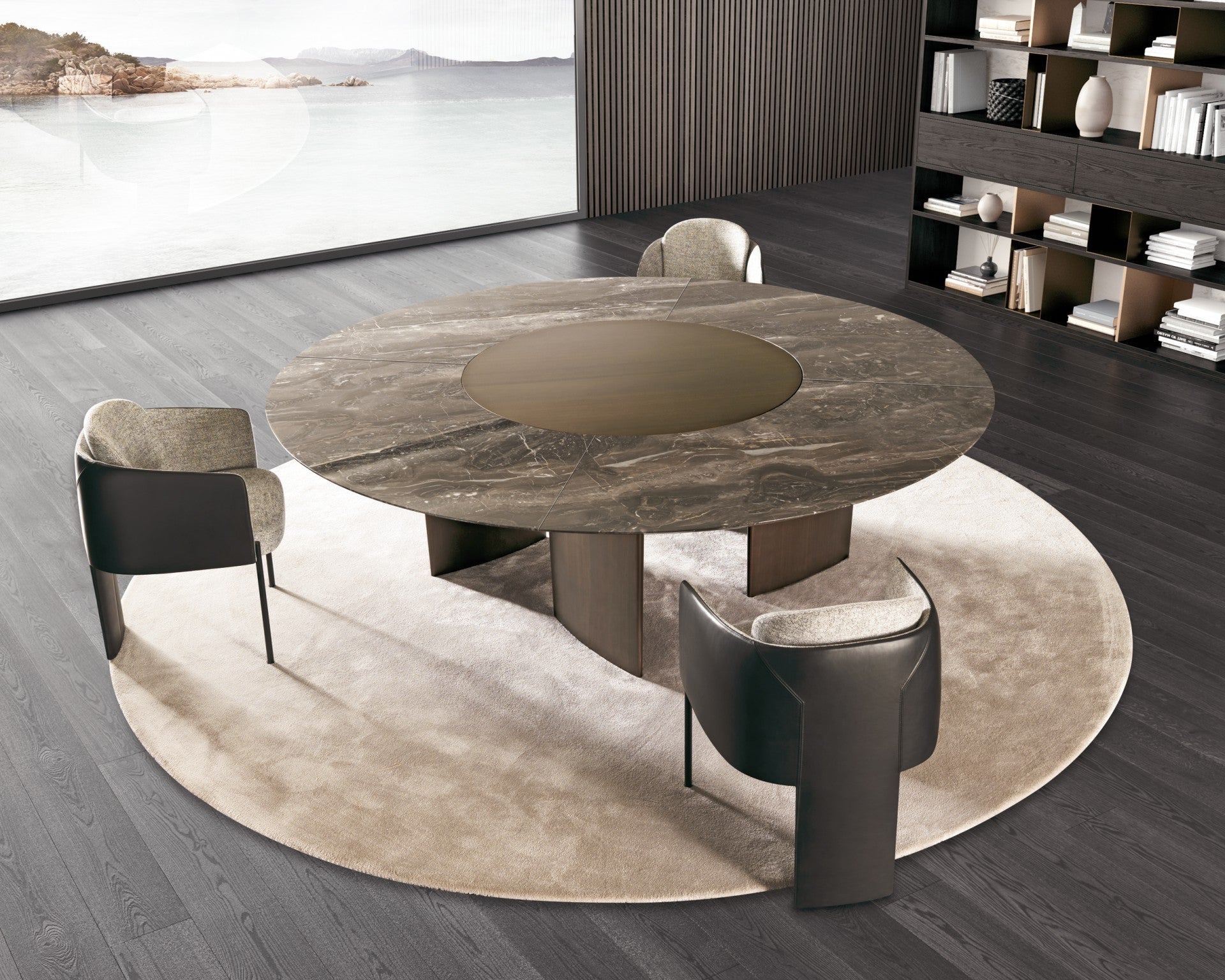 The incredible lightness of the Ala round table takes on a new dimension. The 162 cm marble top, which is equipped with a Lazy Susan, is supported by a dynamic wooden base and defined by a border that slims the perception of its thickness, making it visually suspended.