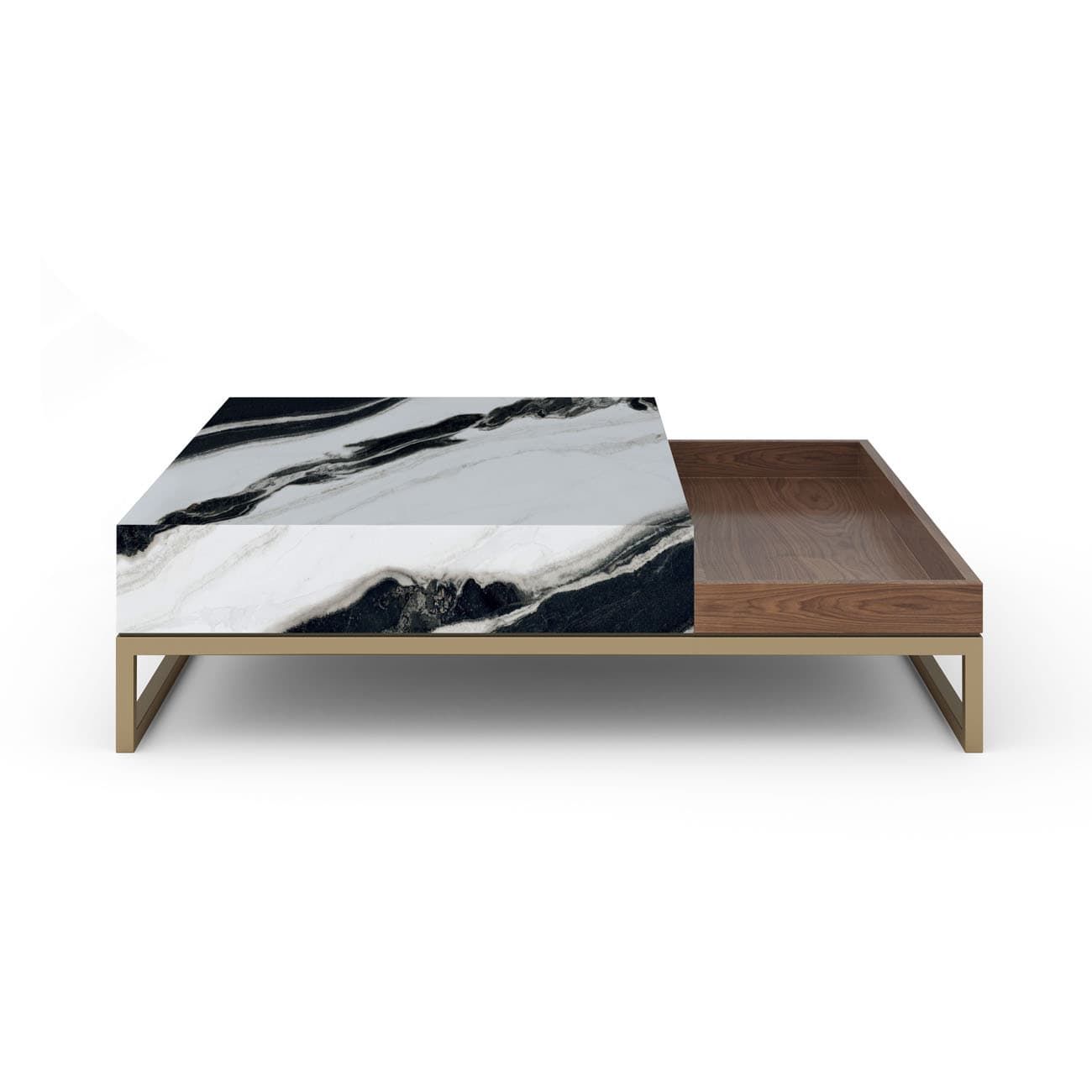 3/4 of the structure in ceramic marble Wave, tray element in solid wood Iroko, metal frame in Light Gold satin finish.