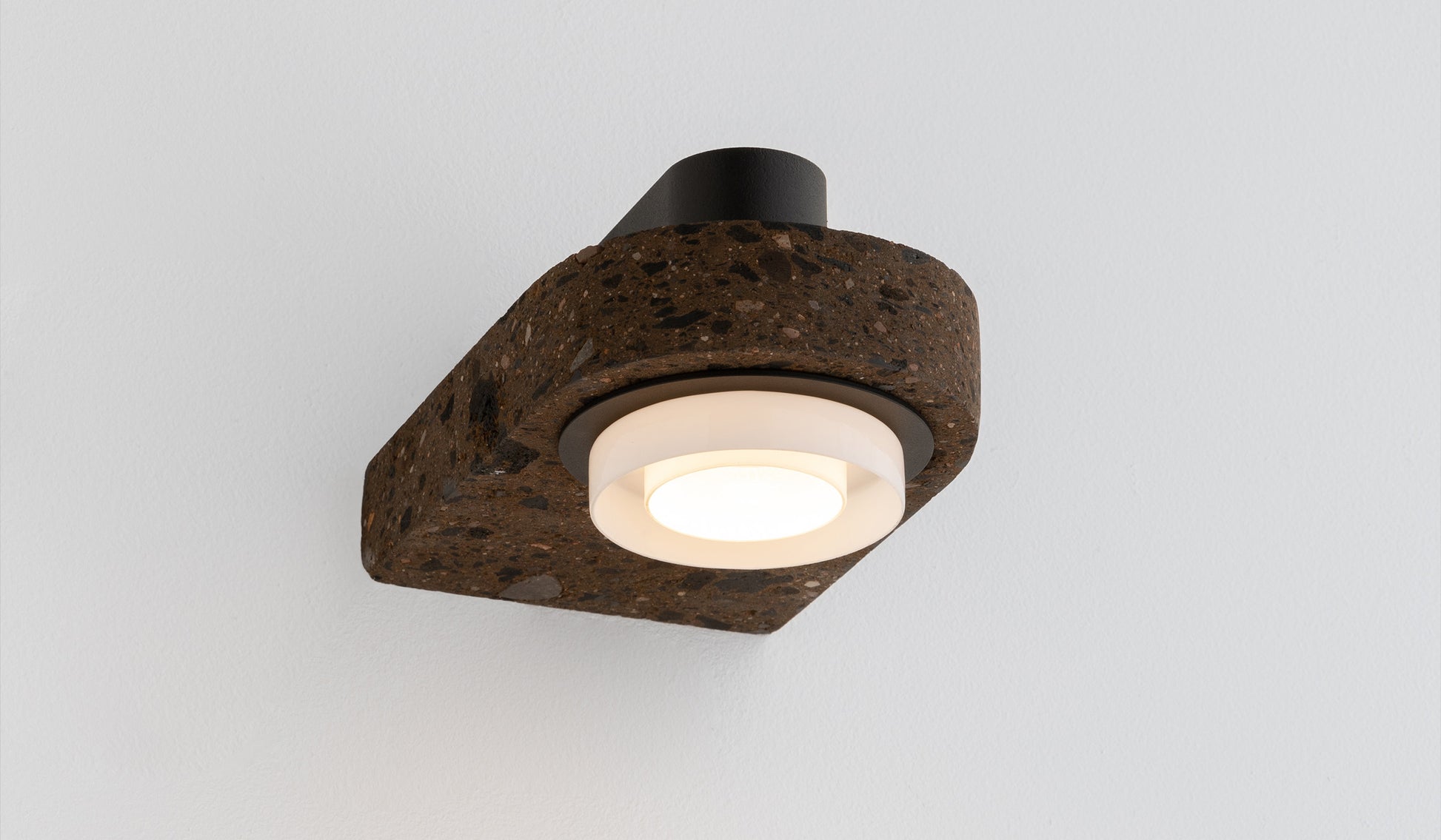 The new series of light sculptures named “Ambra Toba” combines volumes of ancient stones and aluminum. Centerpiece is the Mexican “Toba volcánica” stone that consists of minerals, glass and volcanic debris ejected one million years ago during severe eruptions. Fragments in the geometrical surfaces are testament to these explosions and movement. The contrast between porous textures and smooth dark red underlines the studios contemporary approach on traditional materials and craft. The connecting components between the sculptural stone elements and the aluminum parts originate from an intensive research of linking unique handmade shapes with industrial parts.