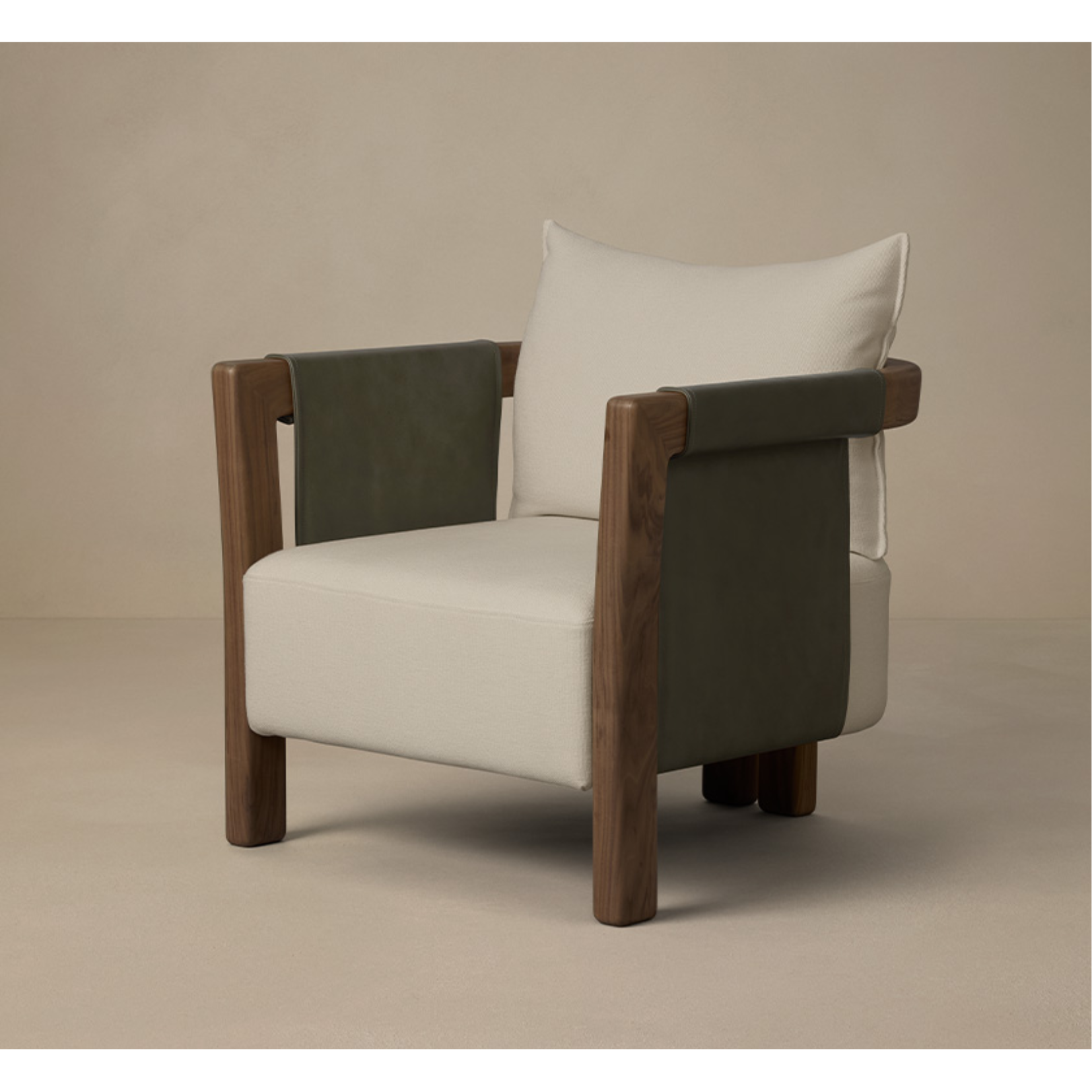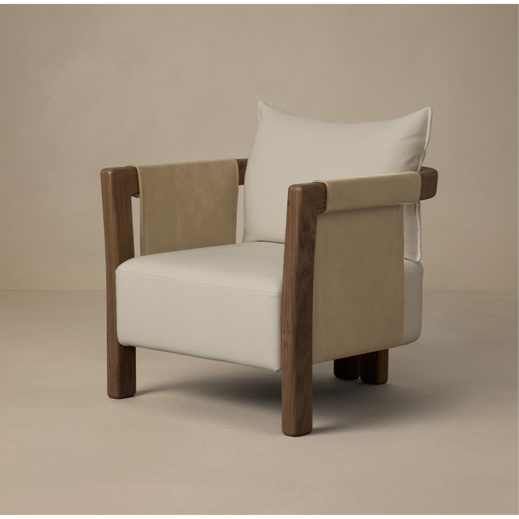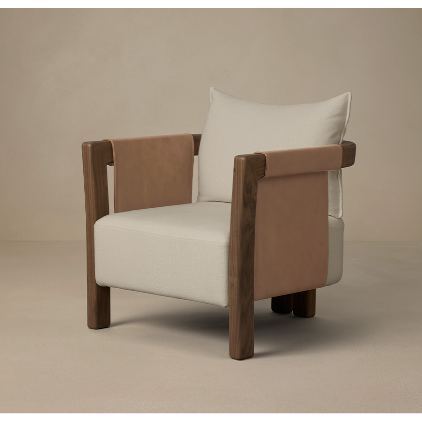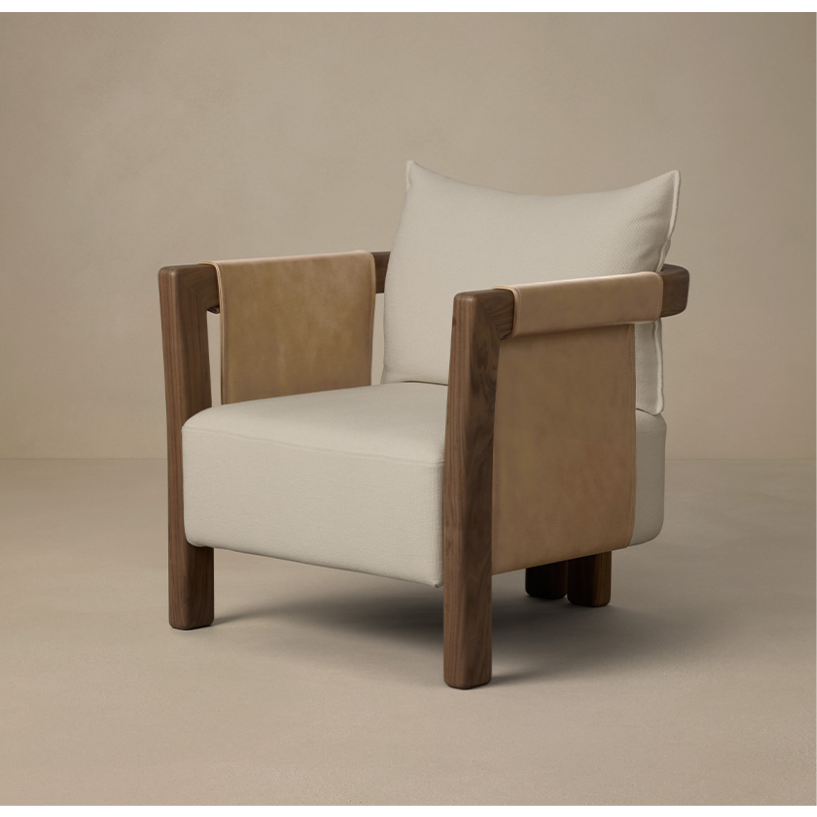 Aptly named Saddle, cushions clad in a linen composite renowned for its durable properties are suspended in a stain proof leather sling uniting two solid walnut legs. Handcrafted by artisans who share a meticulous devotion to proportion and comfort, each piece is united in detailing reminiscent of saddlery and practices of the earliest fashion houses.