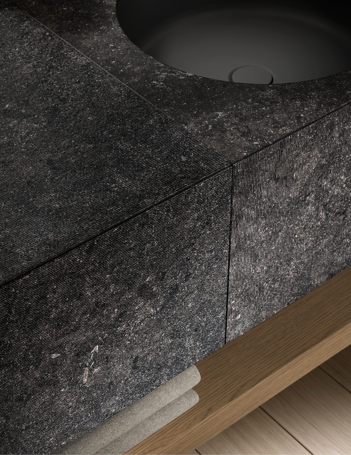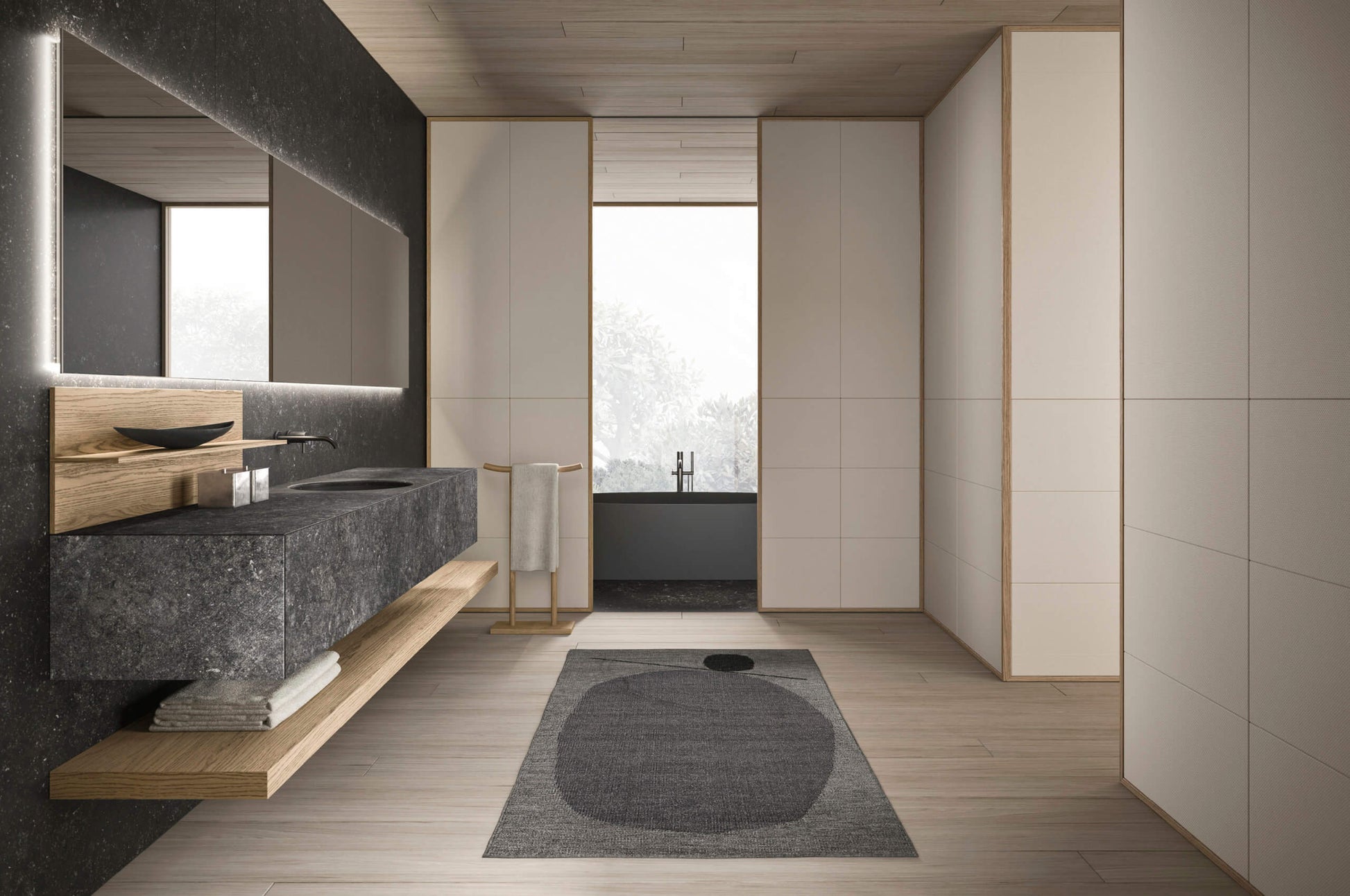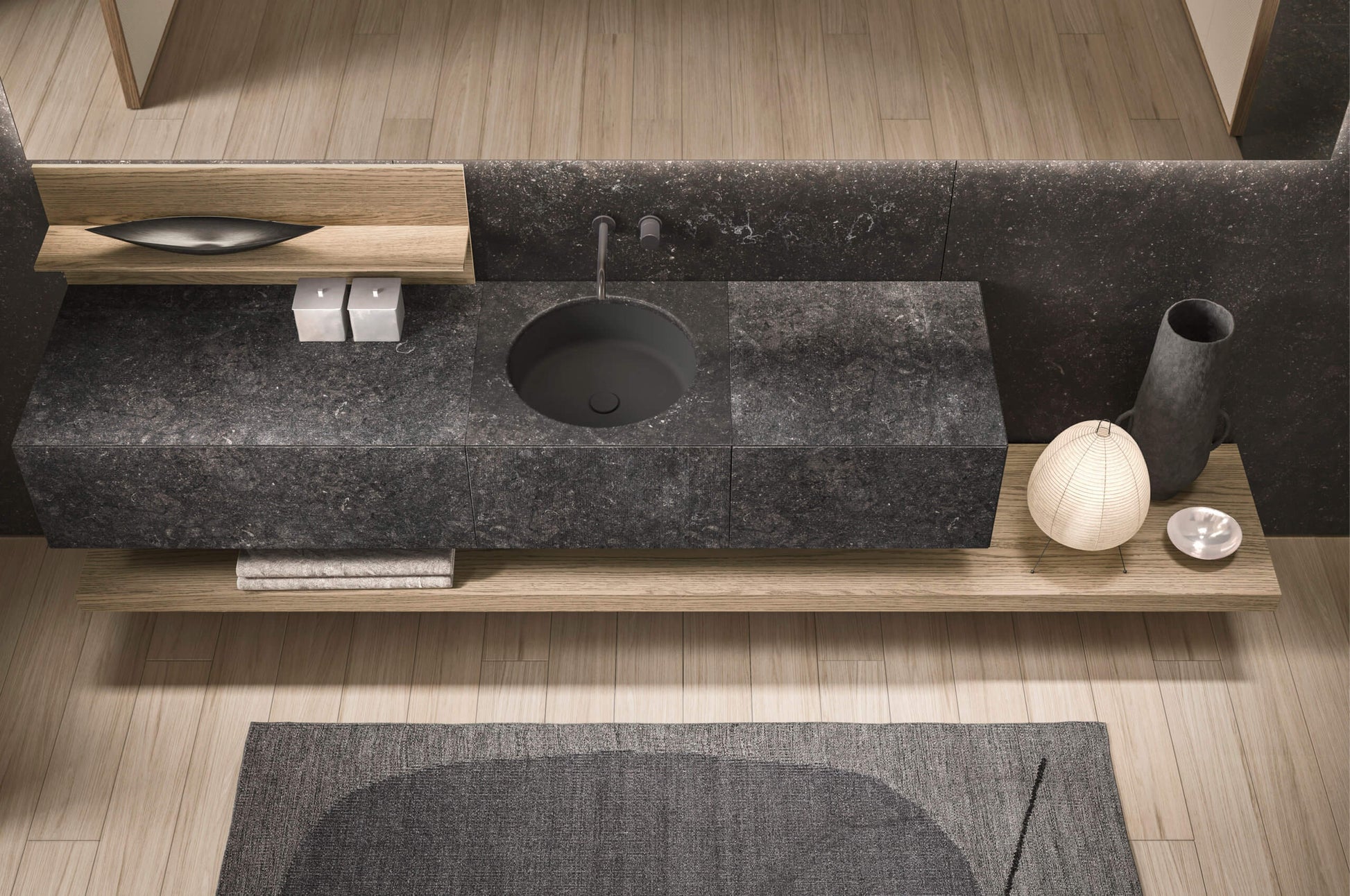 Azuco composition W 270 composed of one base unit with drawer and top W 90 H 32 D 51 cod 4898 and side W 2 cod 4570, one base with drawer, top and undermounted Void round washbasin in Milltek color gel grafite W 54 H 32 D 51 cod 4890, one base unit with drawer and top W 54 H 32 D 51 cod 4896 and side W 2 cod 4570 in Petit Granit marble. Suspended top W 270 TH 6 D 47 cod 2955 and shelf panel W 92 H 33 in Rovere Mezza Fiamma cod 5185. Vetra mirror with four-sided LED backlighting, black anodized aluminum profile W 270 H 75 SP 2.8 custom. Toro series towel rack in Rovere Mezza Fiamma cod 2448. Ljos shelf in basalto lacquered aluminum, complete with accessories. Flow L01 faucet in black PVD steel cod 2552 and 2553. Lidi 05-B carpet cod 4208. Senna sanitary ware in matte white ceramic cod 9311 and 9312, up&down drain cod 9885. Flow W01 black PVD steel flush plate cod 2590. Azuma 85 bathtub in grafite lacquered Cristalplant cod 5100. Zen bench with slats in Rovere Mezza Fiamma W 108 H 35.2 D 44.5 cod 2006. Toro series floor hanger in Rovere Mezza Fiamma cod 5065. Flow L05 faucet in black PVD steel cod 2586 and 2587.