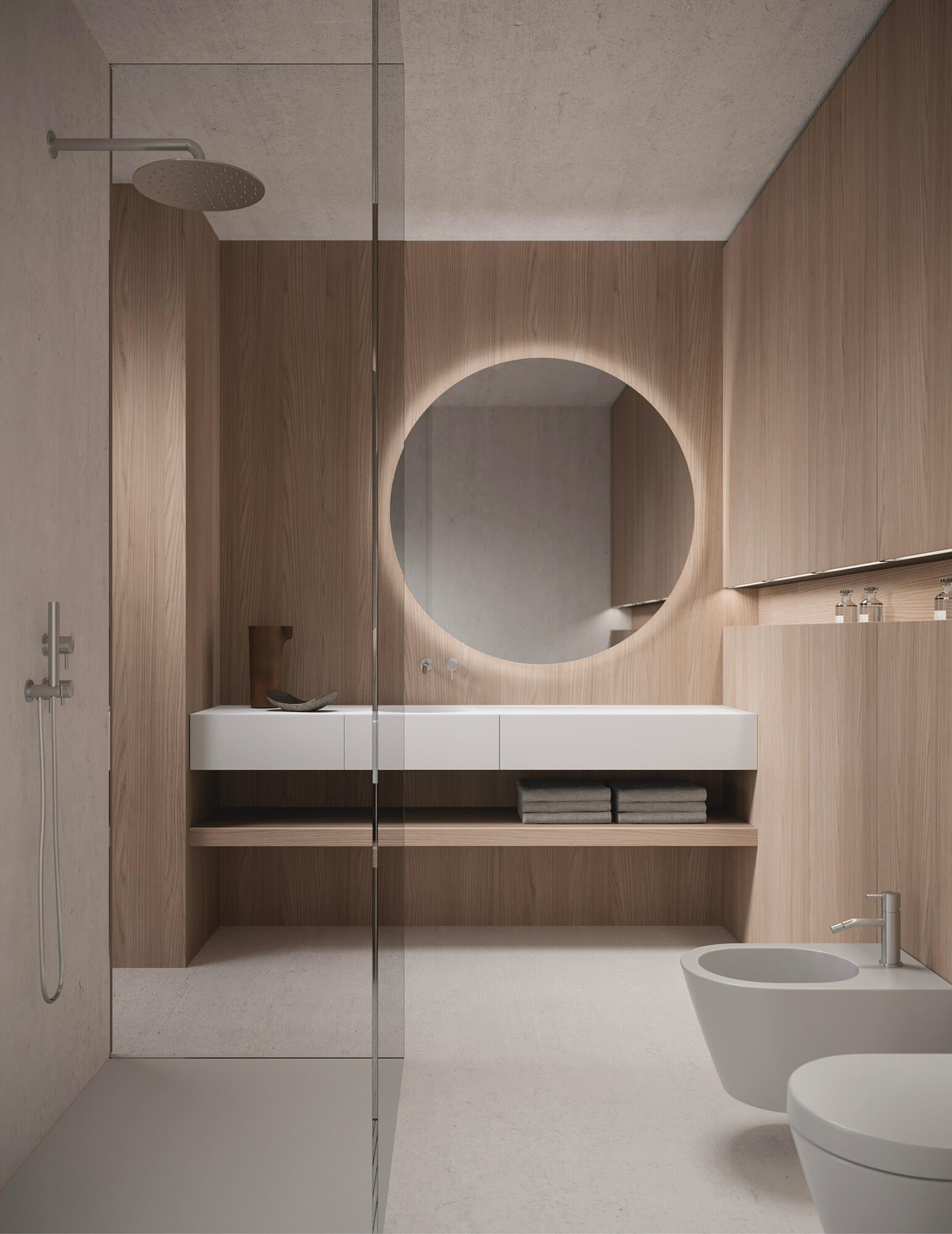 Azuma composition W 198 composed of base unit with drawer W 54 H 19.7 D 51, fixed unit with drawer W 54 H 19.7 D 51 and base unit with drawer W 90 H 19.7 D 51 in Milltek solid white matte. Gap integrated top in Milltek solid white. Suspended top W 198 H 6 D 51 in Venato Cipria faced panel. Leno 120 mirror with LED backlighting. Caba composition composed of three columns with doors, open vanity and LED lighting W 54 H custom D 15.3 cod 6762, bidet and wc columns W 63 H custom D 15.3, two columns with doors, open vanity and LED lighting W 27 H custom D 15.3 in Venato Cipria faced panel. Senna sanitary-ware in matt white ceramic, up&down drain. Matt black lacquered Zeno towel accessory and sanitary fitting accessory. Flow L01 faucet in satin stainless steel. Flow B01 faucet cod 2569 and W01 satin stainless steel flush plate. Flow D01 satin stainless steel shower head and arm; thermostatic mixer, diverter and hand shower D03.
