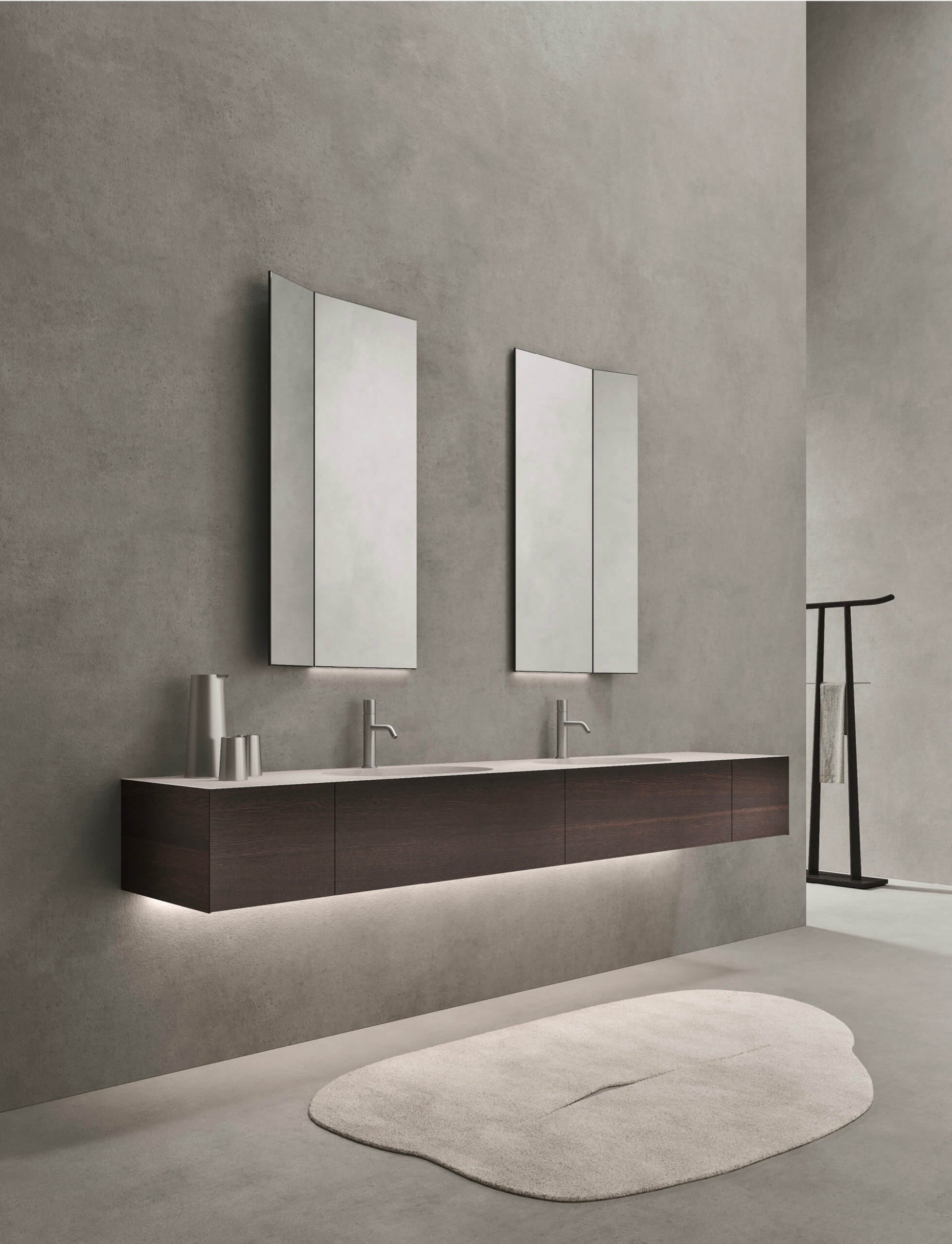 Azuma composition W 256 composed of two base units with drawer W 36 H 32 D 51 cod 4501 and finishing sides W 2 cod 4570, two washbasin units with drawer W 90 H 32 D 51 in Rovere Termocotto cod 4389. Round 02 integrated top with double washbasin in Milltek solid stone Dove L 256 cod 6539. Two Klose mirrors with panel in Sillmatt Antracite and bottom LED lighting cod 4280. Toro series floor-mounted in Rovere Carbone cod 5065. LED lighting for bases W 252 cod 9645. Flute L03 faucet in satin-finish stainless steel cod 5837.