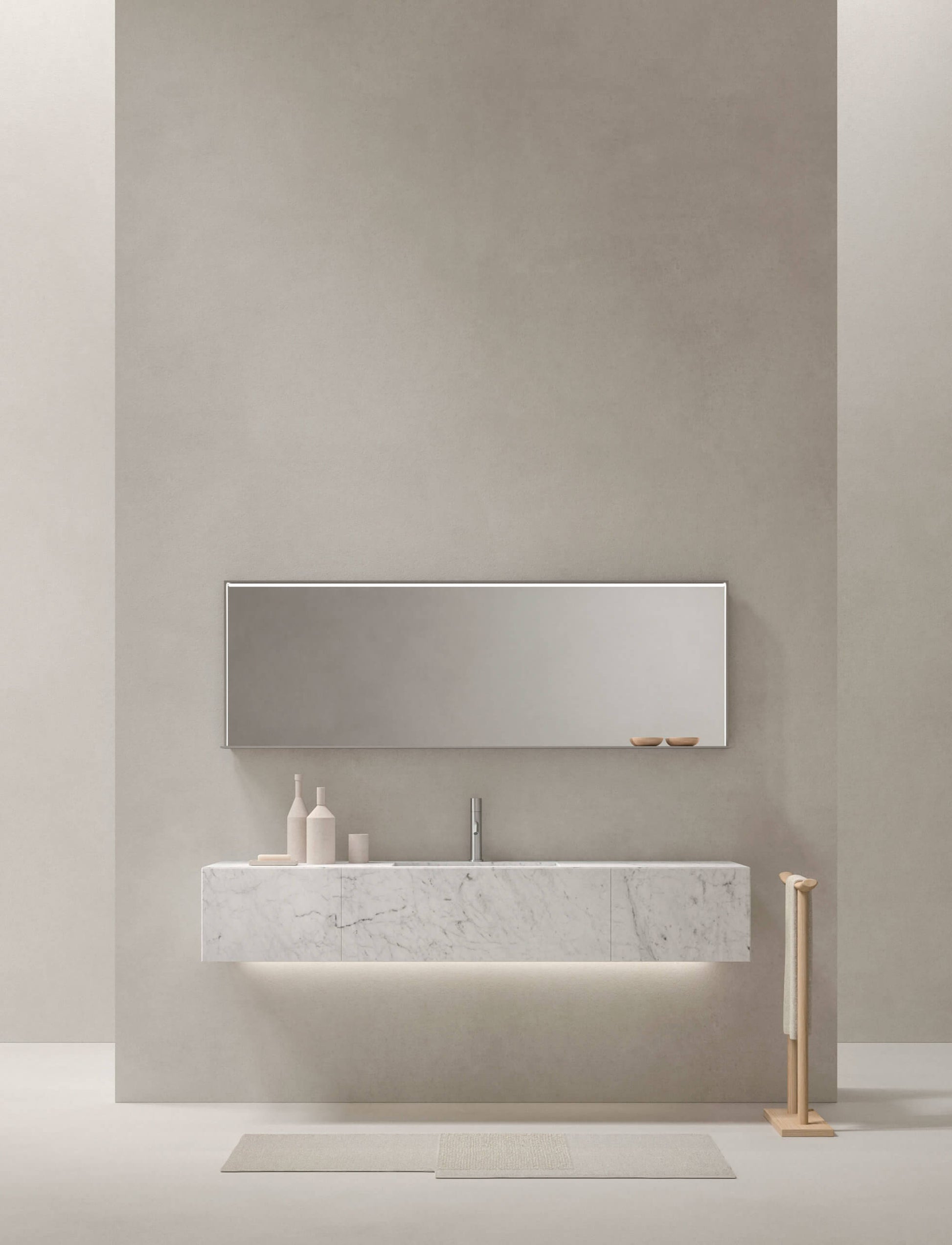 Azuma composition W 184 composed of two base units with drawer W 45 H 32 D 51 cod 4502 and finishing sides W 2 cod 4570, washbasin unit W 90 H 32 D 51 in Bianco Carrara marble cod 4389. Luto integrated top W 184 in Bianco Carrara marble cod 4367. Ekos Plus Platino mirror with interior lighting W 180 H 60 TH 16,5 cod 6639. Toro series towel rack in Rovere Mezza Fiamma cod 2448. Flute L03 faucet in satin-finish stainless steel cod 5837. Plain 02-W carpet cod 4106.