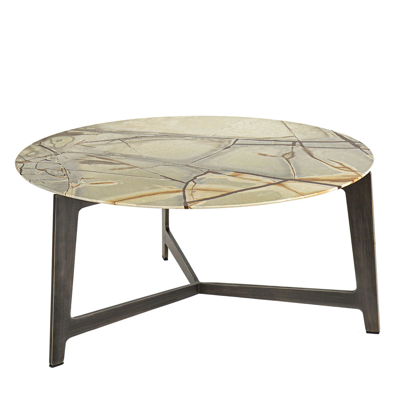 The B160 round marble coffee table by Carlo Bimbi features a medium-sized circular top characterized by striking Blue Island marble. Its geometric metal base in Delabrè finish combines thin yet sturdy legs arranged in a distinctive angular pattern that immediately draws attention. The table's balanced proportions make it suitable for various living spaces and customization options and alternative finishes are available on request. Please contact the Concierge for additional information.