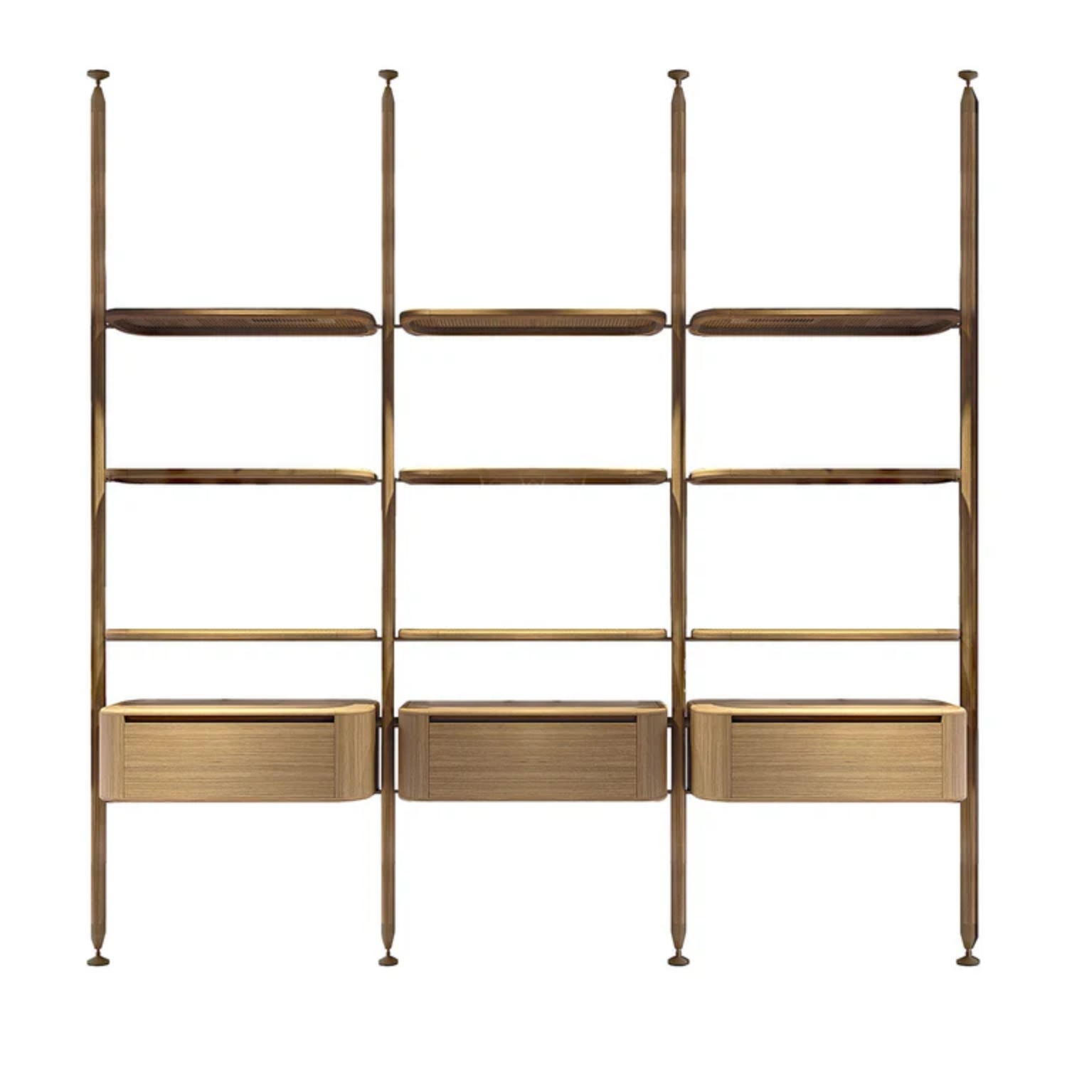 Three closed storage units, each surmounted by three shelves, define the multi-functional design of this bookcase. Perfect as a room divider for open-space decors thanks to its generous dimensions, it distills a sense of lightness with its Vienna straw shelves held together by vertical ash shafts sealed by metal details.