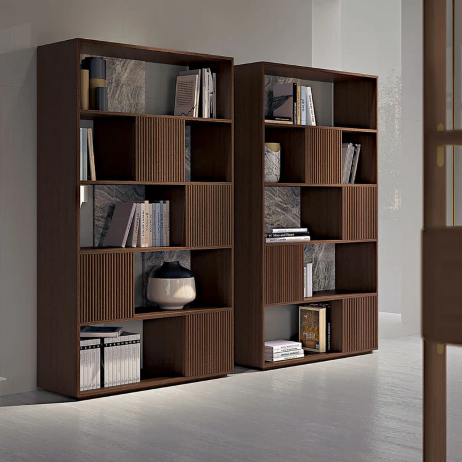 This exclusive walnut bookcase reveals all of its decorative potential with its closed and open compartments. Perfect for complementing a private study or a living room, it boasts Grey Shiny earthenware bottom panels whose traceries combine with the pleasant channeled texture of the closed units' doors.