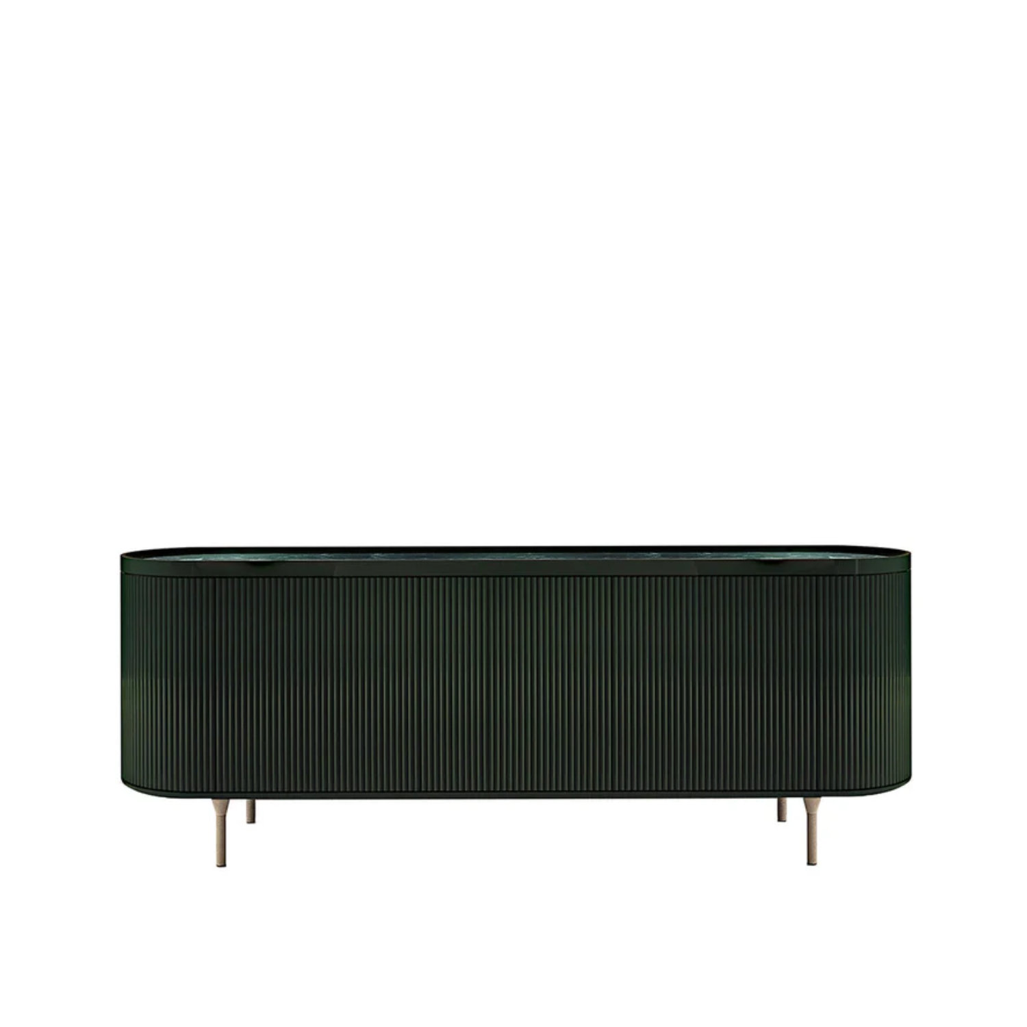 This superb sideboard is an exercise in captivating textures and harmonious lines. Marked by rounded sides, it features a mesmerizing St. Denis Shiny earthenware top and an extensive channeled texture that distinguishes its design. Raised on burnished brass feet, it is equipped with three doors opening to reveal wide storage units.