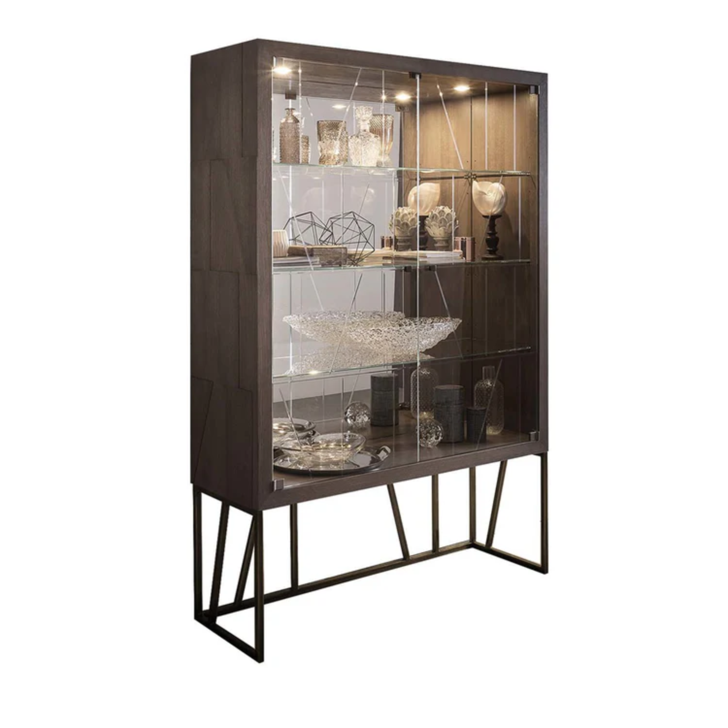 Exuding refined sophistication, this cabinet merges the art of traditional craftsmanship with a unique, contemporary allure. This stunning piece is composed of a burnished brass base marked by straight and diagonal lines, a thick and elegant durmast wood frame, and two doors made of etched glass. The inner shelves are also made of glass, and the back panel features a mirror enriched with LED lights. This cabinet is available in other finishes and without LEDs.
