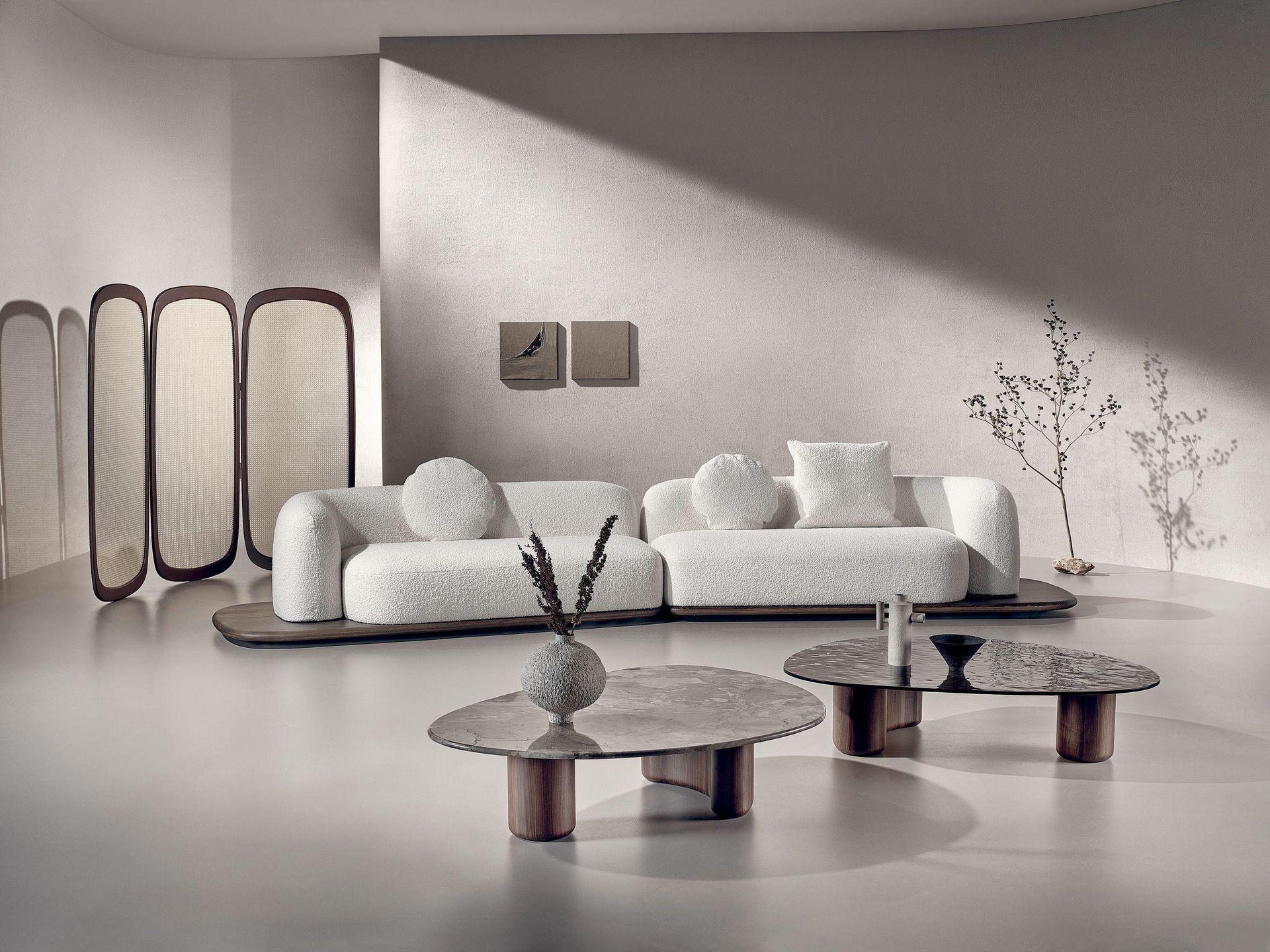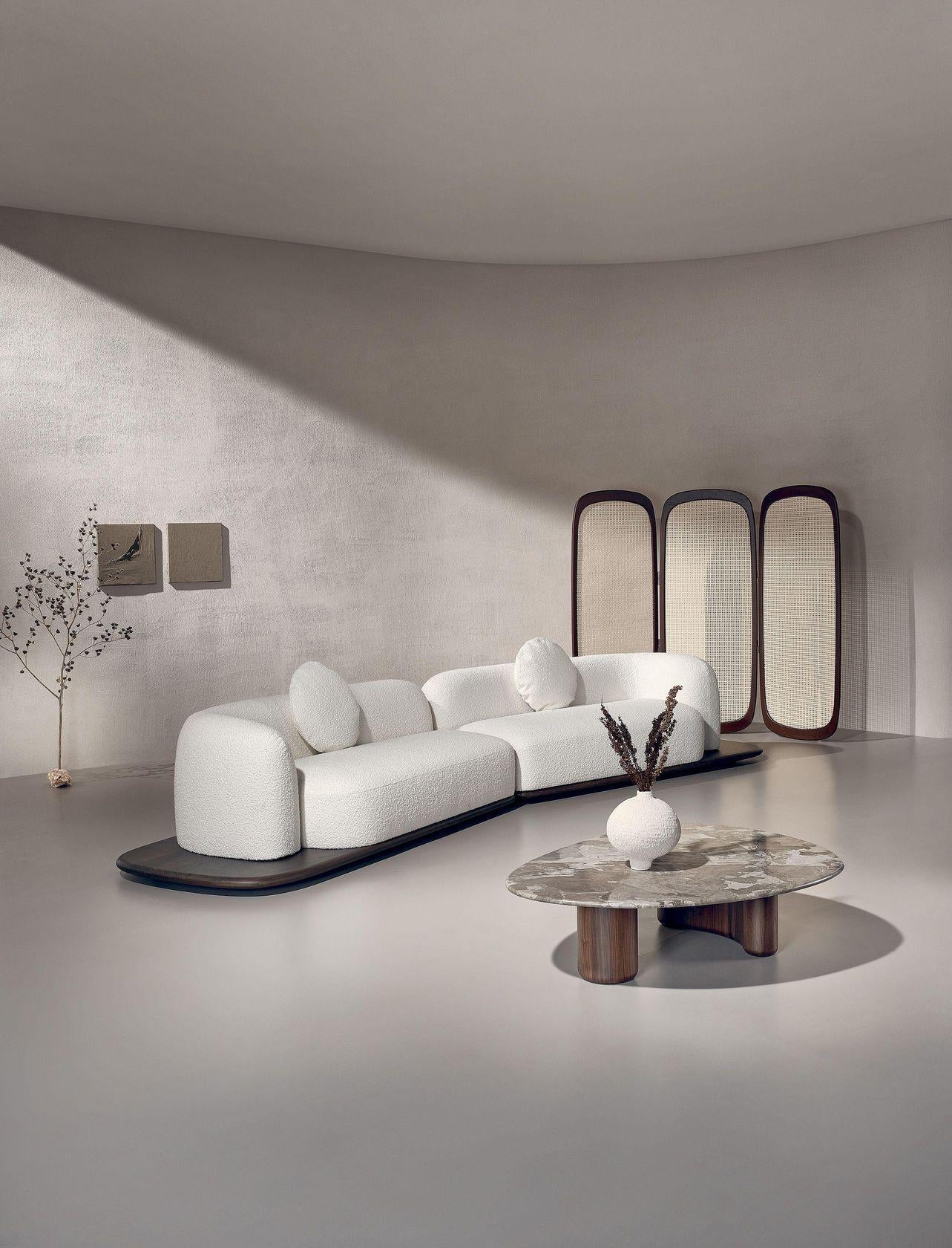 Designed as a soft, welcoming embrace to retreat to at any time of the day, the Dune Wood modular sofa stands out for its soft, rounded shapes that give it a beautiful, harmonious air inspired by nature itself. The sofa can be customized by combining different types of modules depending on the specific need for comfort and space. The sinuous wooden base lends solidity and warmth, while the cushions can be upholstered in fabric, leather, or nubuck.