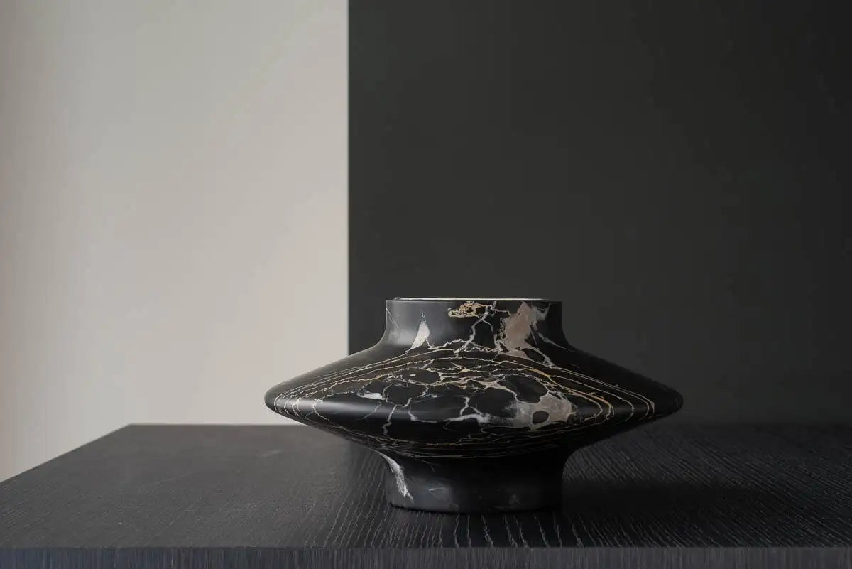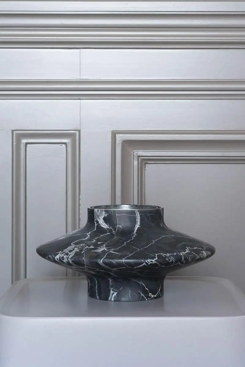 Black Gamma candleholder by Frederic Saulou. Dimensions: Ø 26.8 x H 13 cm Materials: Portoro Paonazzo Frederic Saulou's sculpted design artworks introduce a series of work coming from researches and partnerships between local ateliers and designer, and implemented to another scale, that of the object and contemporary creation. Frédéric Saulou is a prominent French contemporary designer. Considered by many institutions and critics as one of the most talented designer of the new generation in France.