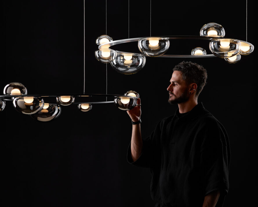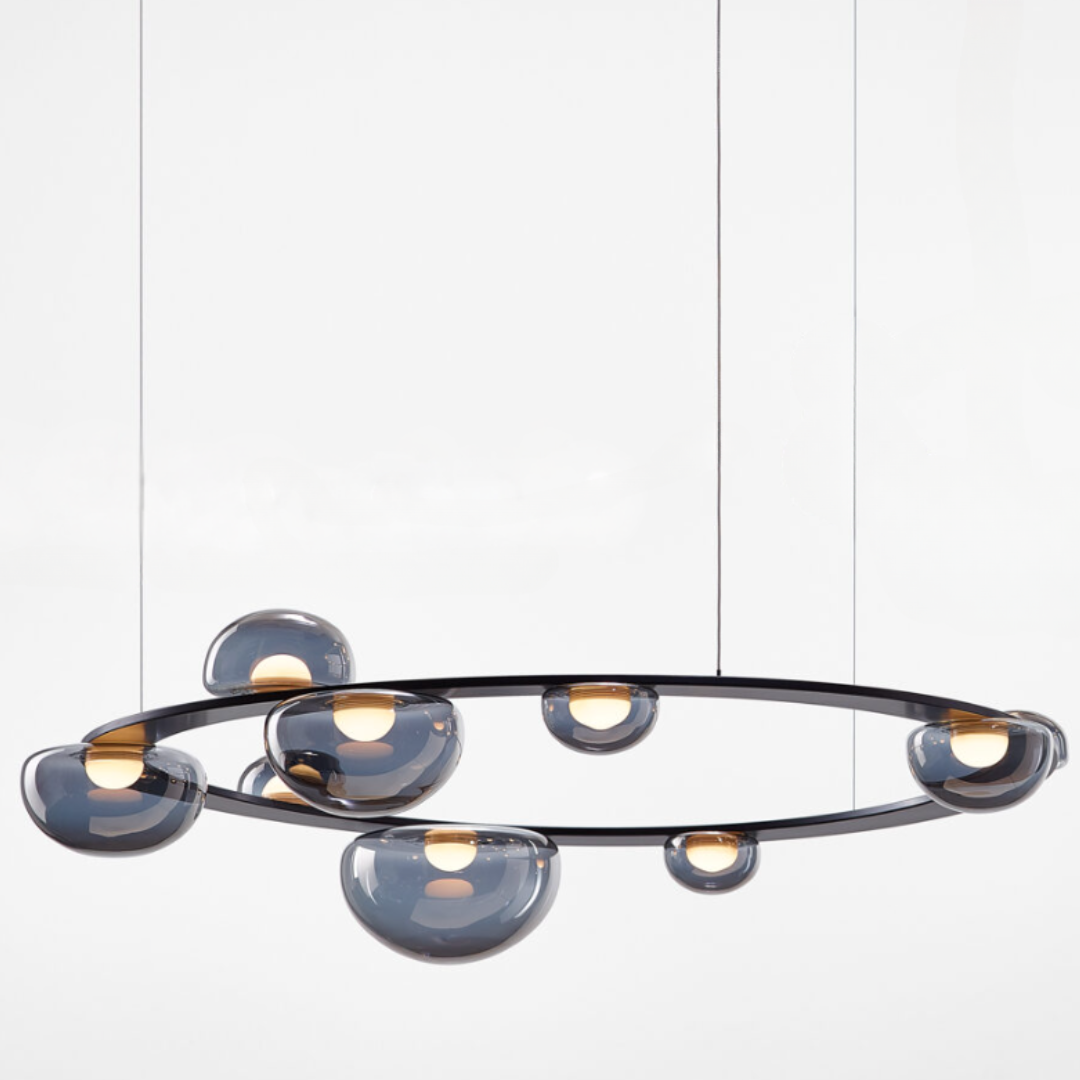 Dew Drops Circle transforms this poetic vision into a more monumental, spatial form: a ring that can be suspended above a dining table, kitchen island, or lobby area to create a striking, elegant lighting accent.