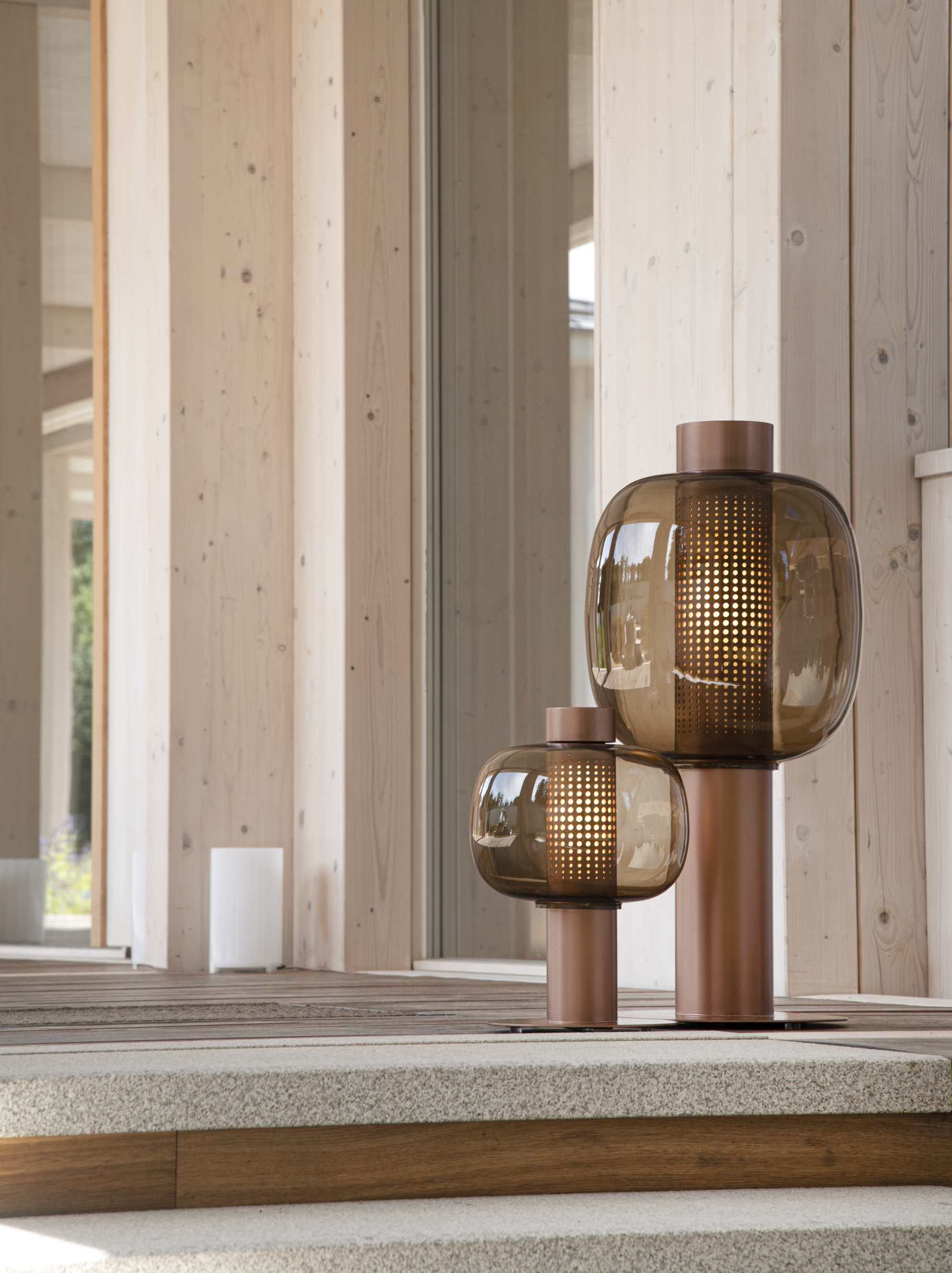 The new light uses a simple stainless-steel base finished in an environmentally friendly powder coating. The easily removable LED light source casts a gentle glow through a diffusor and laser-cut openings in the stainless steel. The likeness to the traditional bonbori lamp is achieved with an elegant handblown glass shade, an extraordinary piece crafted from multiple layers of carefully moulded glass.