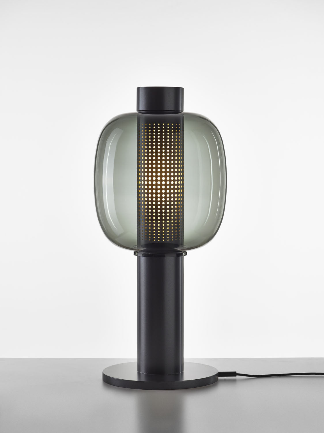 The shade comes in opal and opaline glass, while the metal base is available in black matte, copper metallic matte, or grey metallic matte.