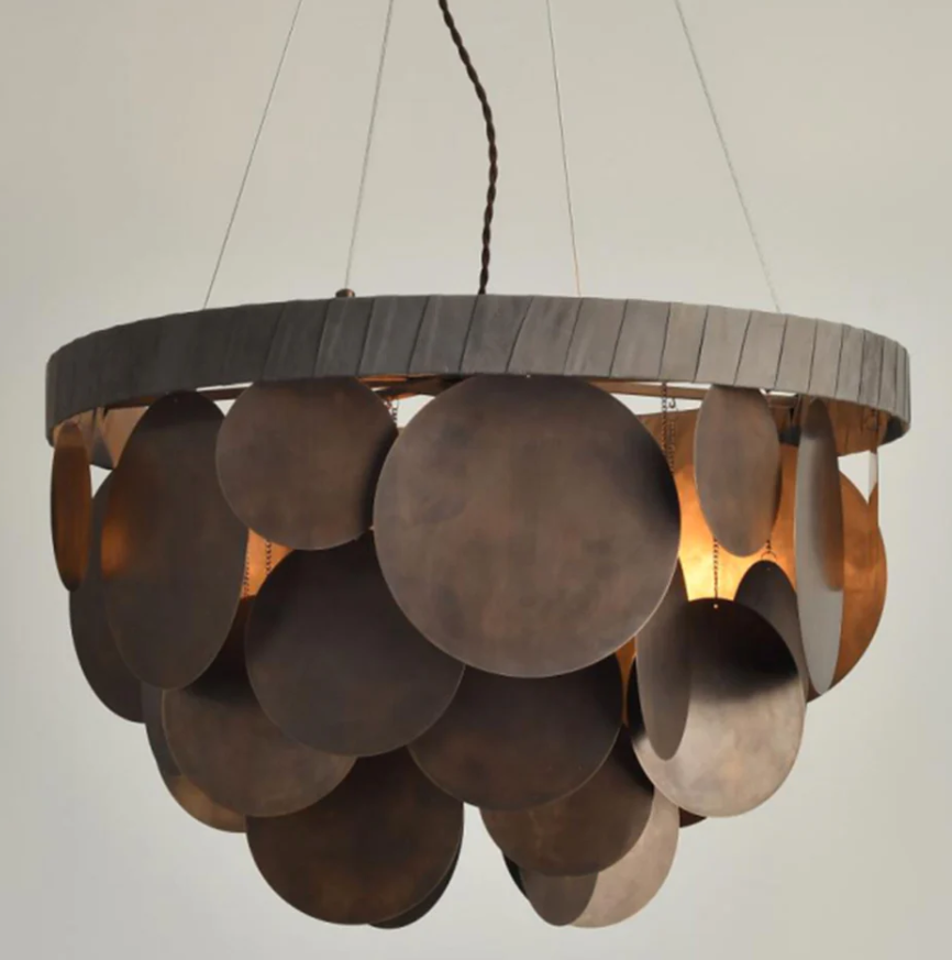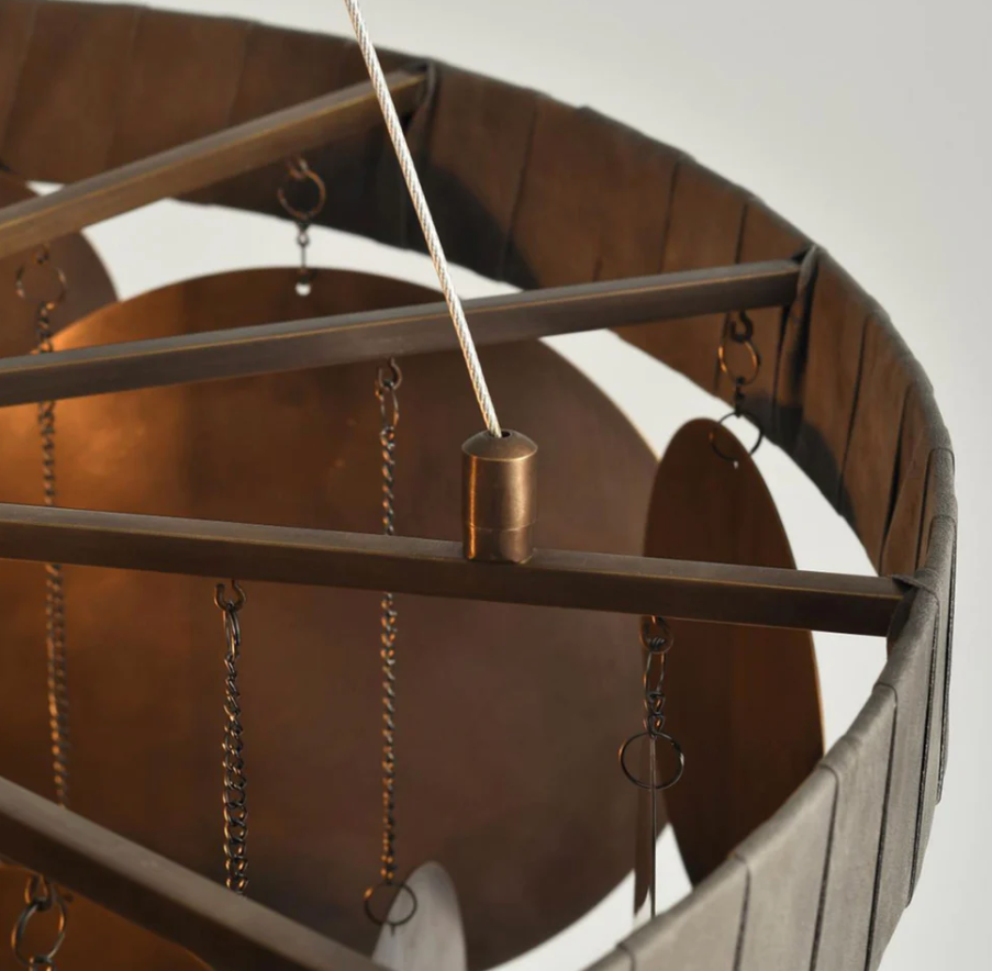 CIEL Chandelier is an exclusive ceiling lamp with discs in Burnished Brass. The CIEL Chandelier/ceiling lamp is decorated with beautiful leather trim. The burnished discs in brass are hanging in chains, which easily can be placed on the frame on small hooks. The height of the suspension is also very easy to adjust. There may be variations in the surface, as browning is a surface treatment of brass, which patinas and oxidizes over time.