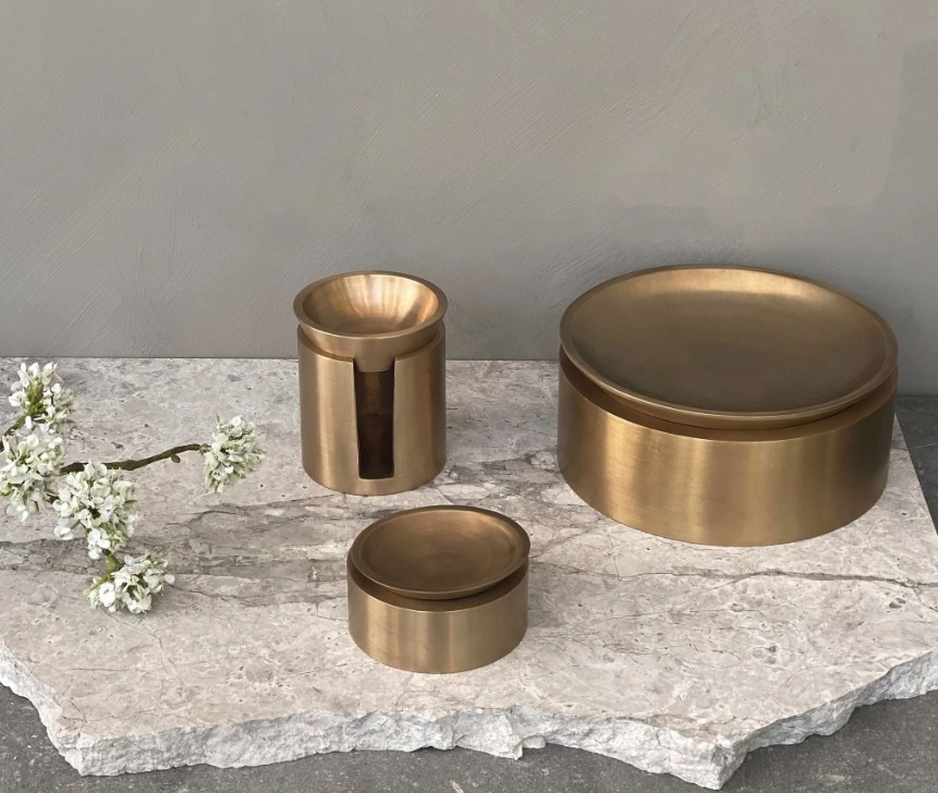 The EDO canister collection is designed by Julie Brandt for BRANDT Collective comes in Satin Brass, Burnished Brass and Satin Aluminum as well as in the marble colors: Chalk Grey (beige), Smoke Grey and Shadow Black.