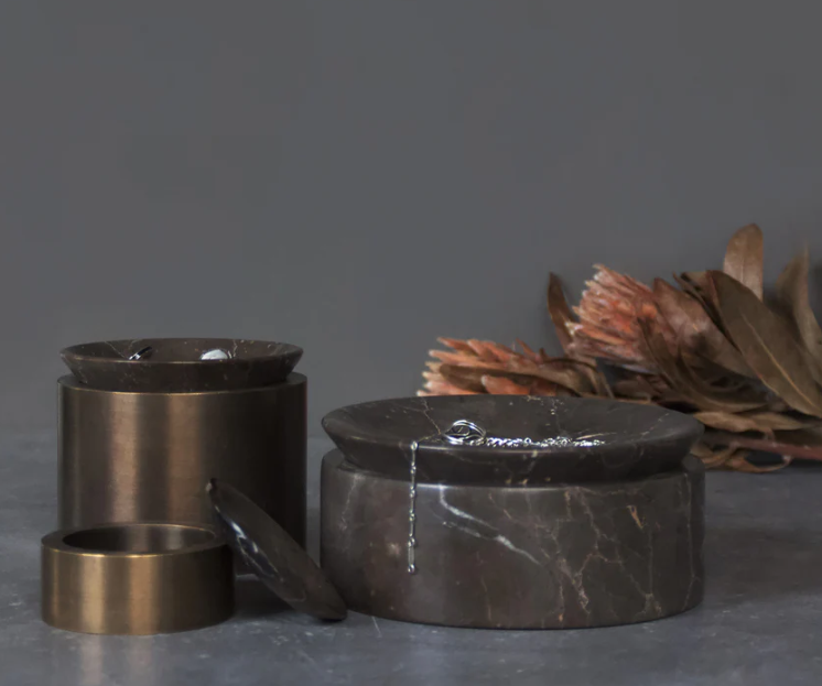 EDO Canister Low in the colour Shadow Black is a beautiful marble jar with a small elevation in the lid. This simple and lovely canister or jar has an exclusive and timeless look that adorns all spaces.