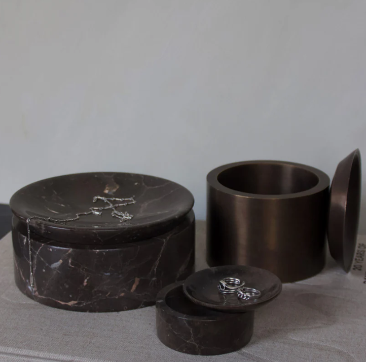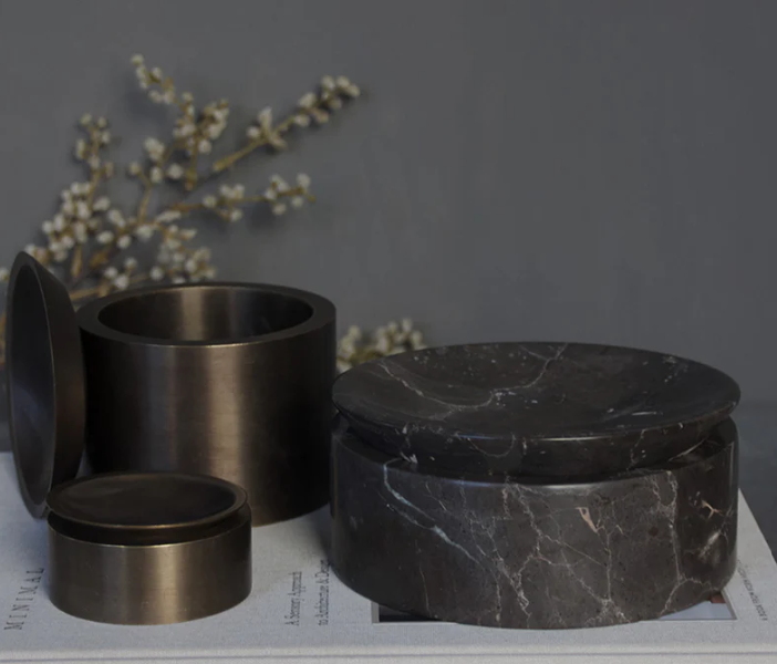 The EDO canister collection is designed by Julie Brandt for BRANDT Collective comes in three marble colors: Chalk Grey (beige), Smoke Grey and Shadow Black and is also available in a Small, Large and Low version.