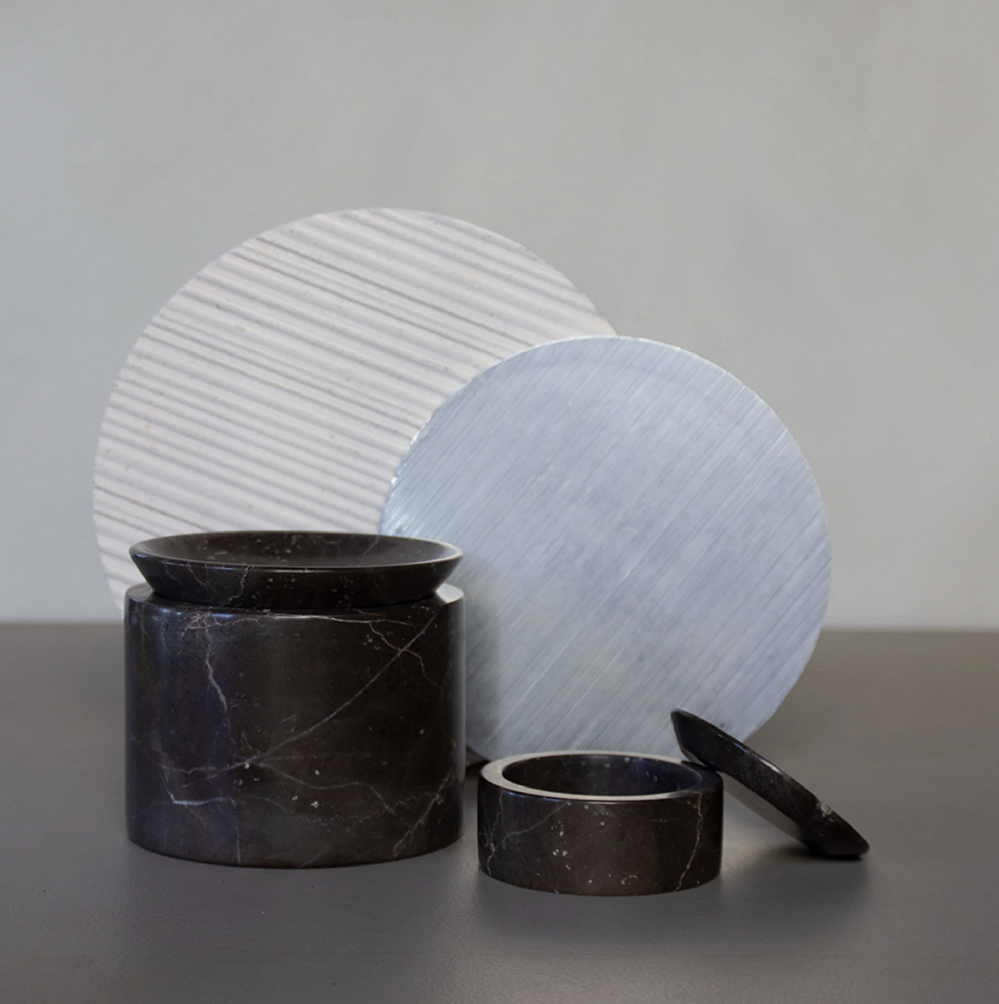 The EDO canister collection is designed by Julie Brandt for BRANDT Collective comes in Satin Brass, Burnished Brass and Satin Aluminum as well as in the marble colors: Chalk Grey (beige), Satin Brass and Smoke Grey.