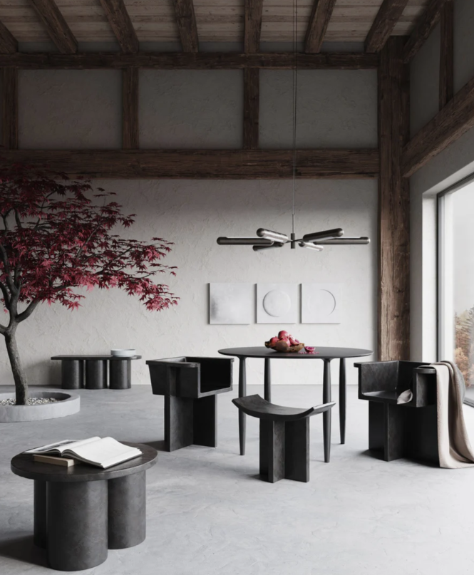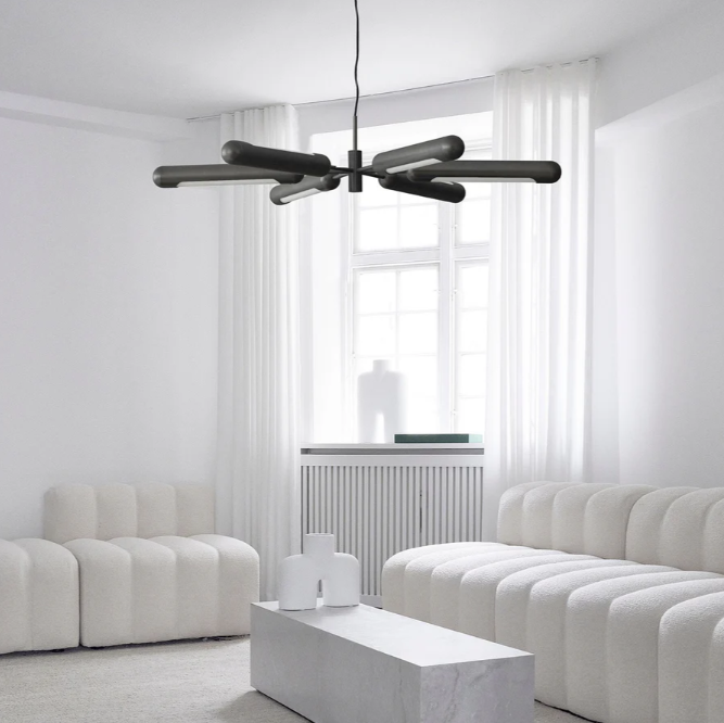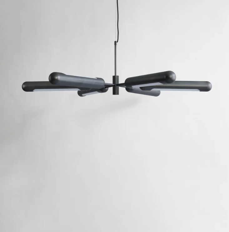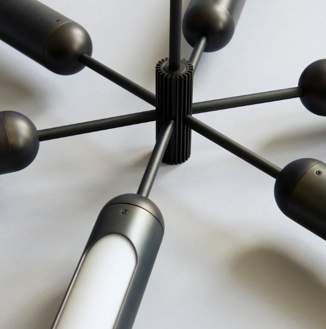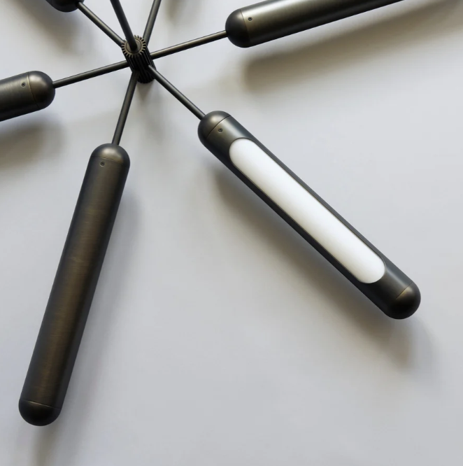 The Bullet collection is characterized by a closed tubular metal lampshade with a smooth carved opening. The opening is covered in a curved piece of opal glass, filtering the light from the lightsource inside. The collection comprises a chandelier, a pendant and a wall lamp - all made in bronze plated iron and opal glass, creating unique and sculptural lighting experiences inspired by Art Deco.