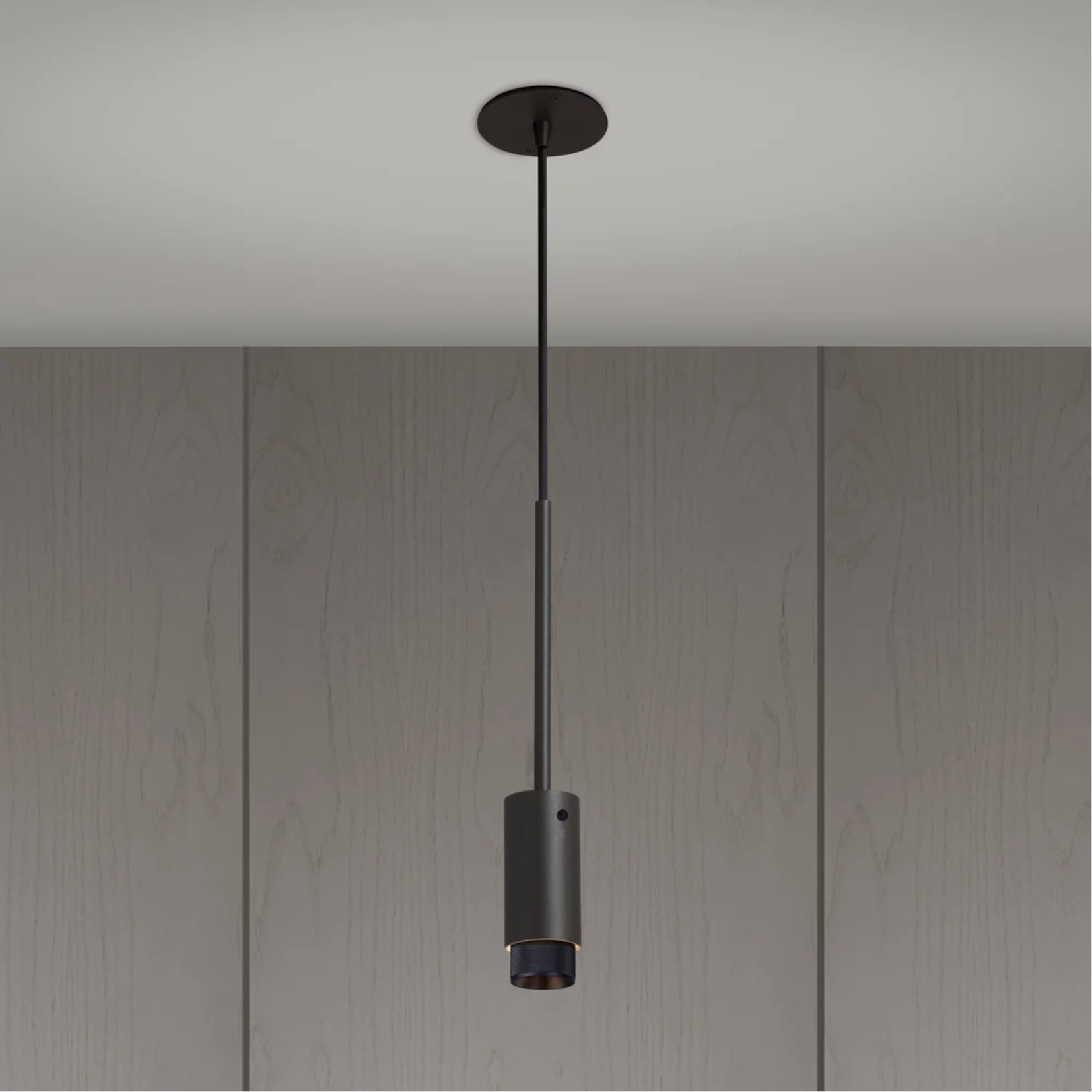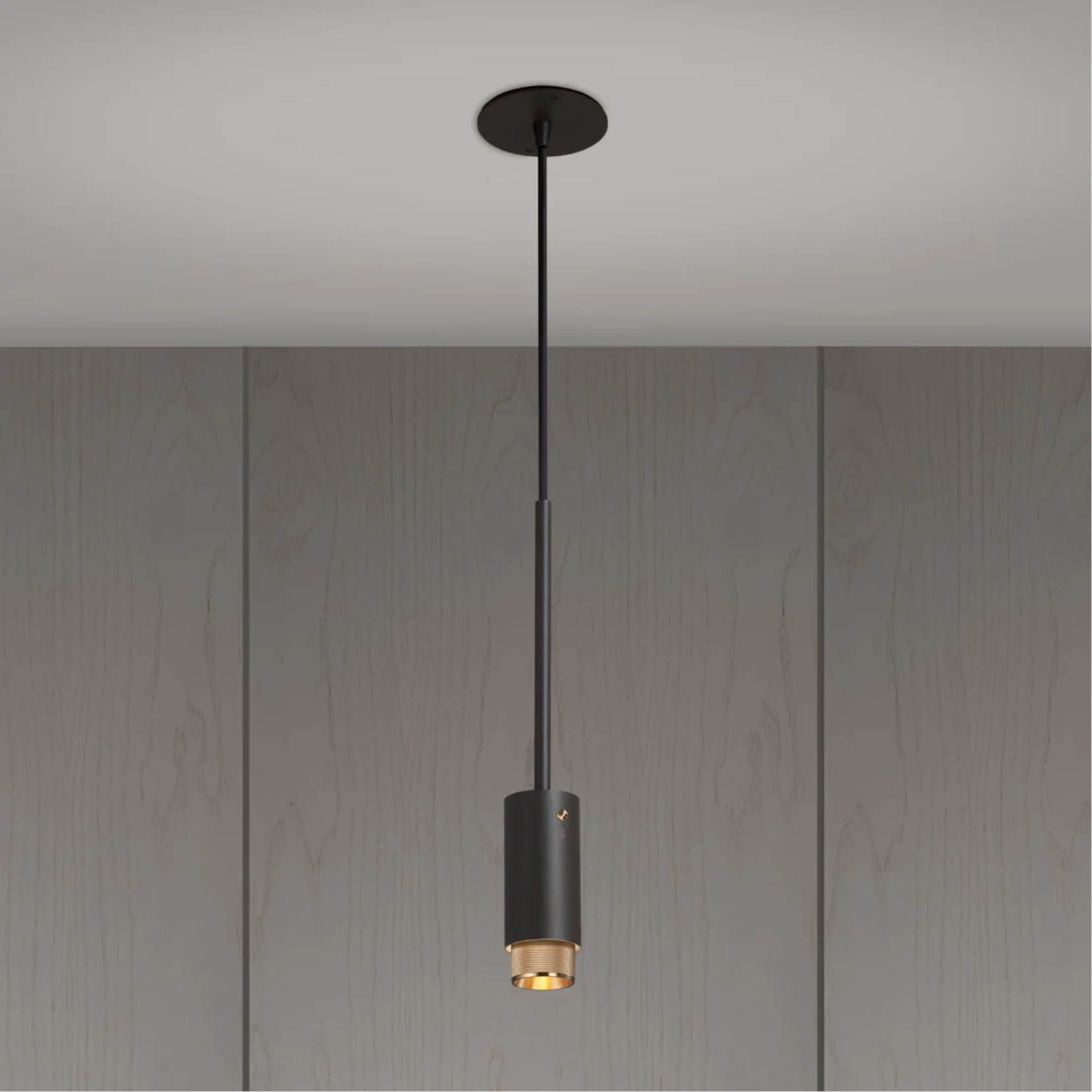 A pendant spotlight with a powder coated metal body and solid metal detailing. The pendant features our signature solid metal cross-knurl baffle and machined screws. The baffle captures light and creates a delicate metallic glow, whilst a honeycomb filter delivers a precise, low-glare, directional spotlight. This spotlight fits a GU10 bulb, sold separately.