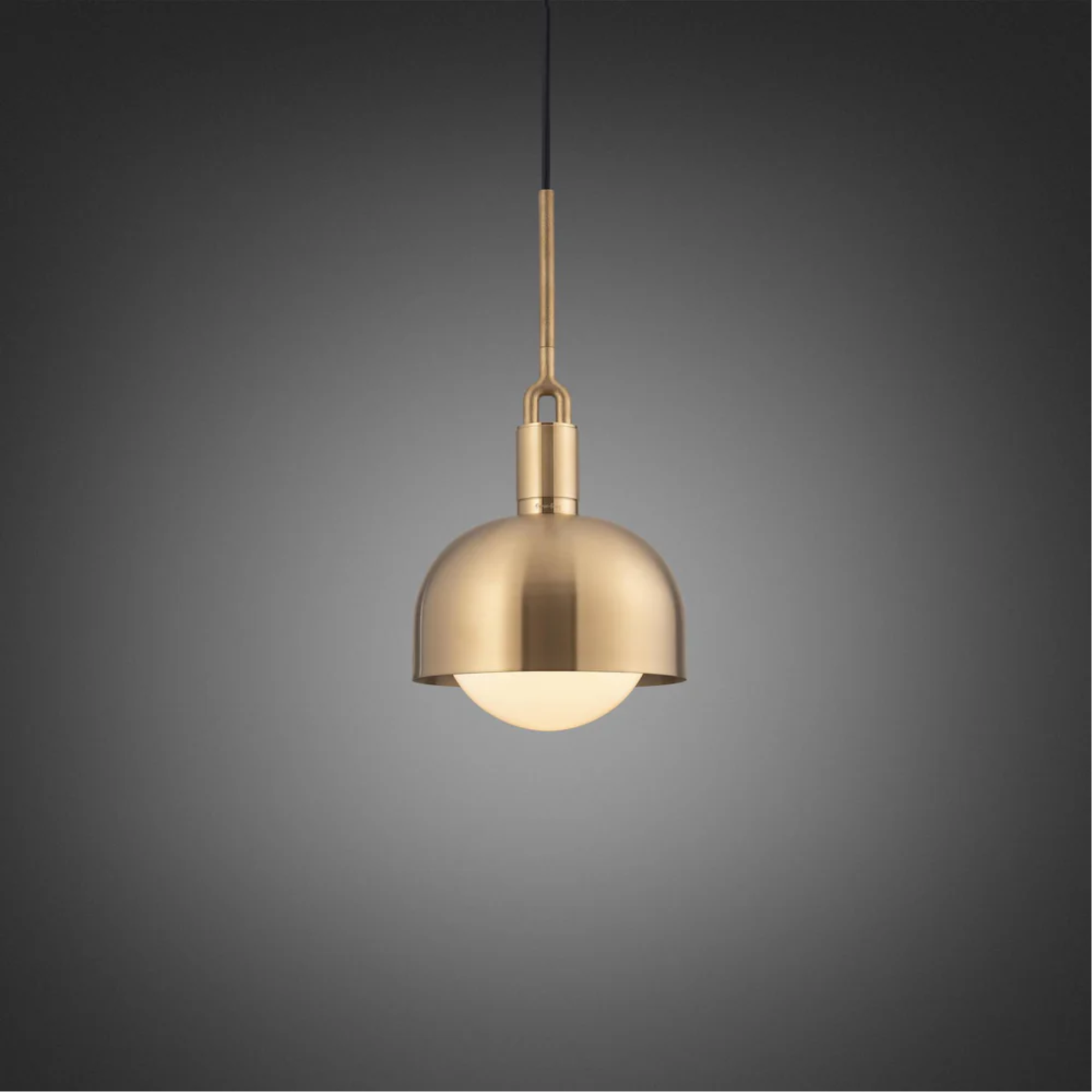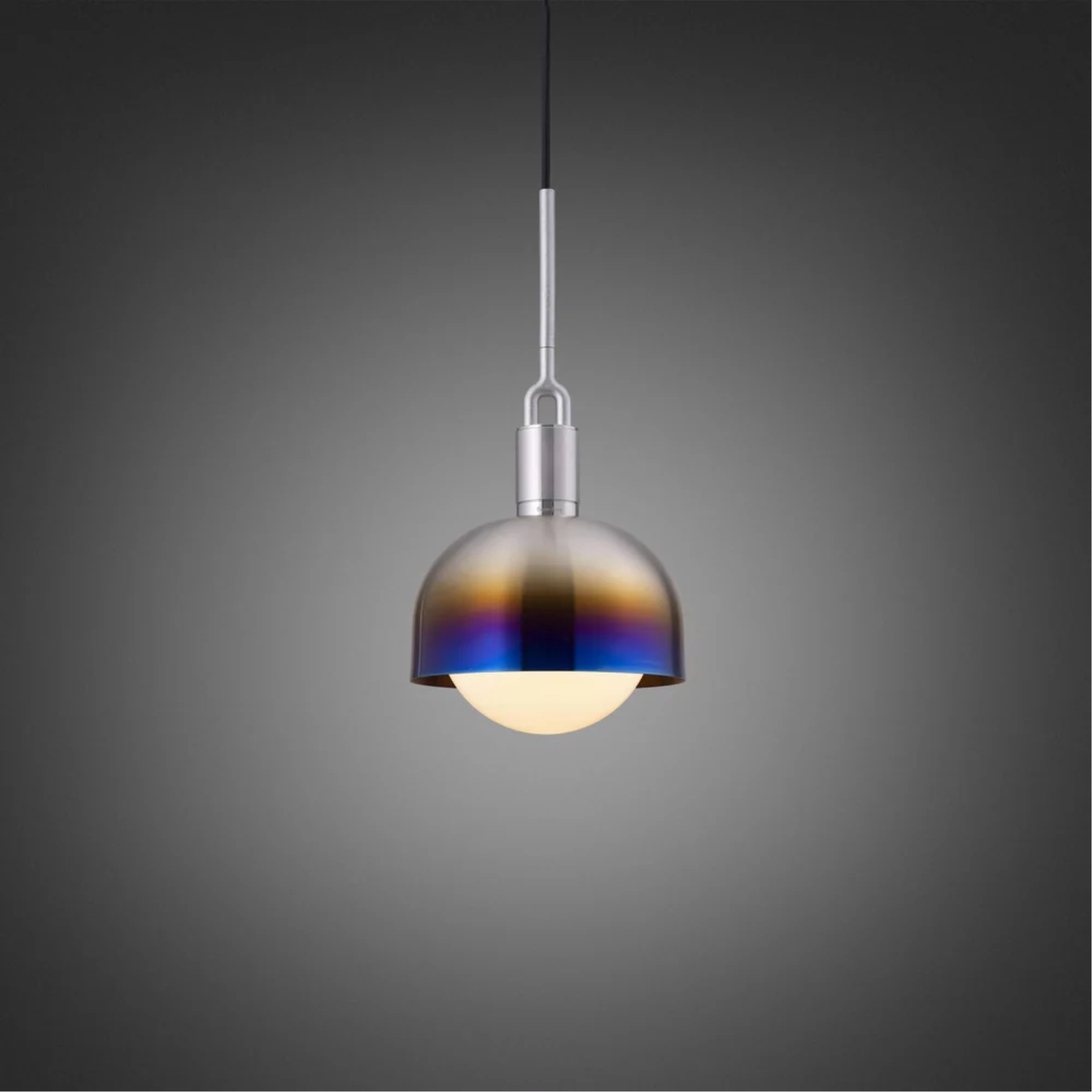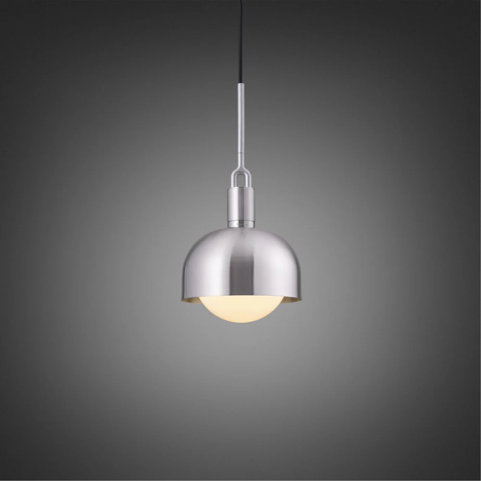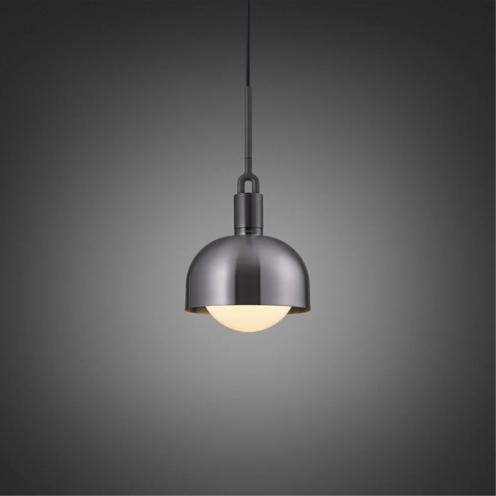 A light pendant made from cast and machined metal, featuring our signature diamond-cut linear knurl pattern and fork detailing, refined by hand. Its shade is made from hand-spun metal and it comes with a handblown glass globe.