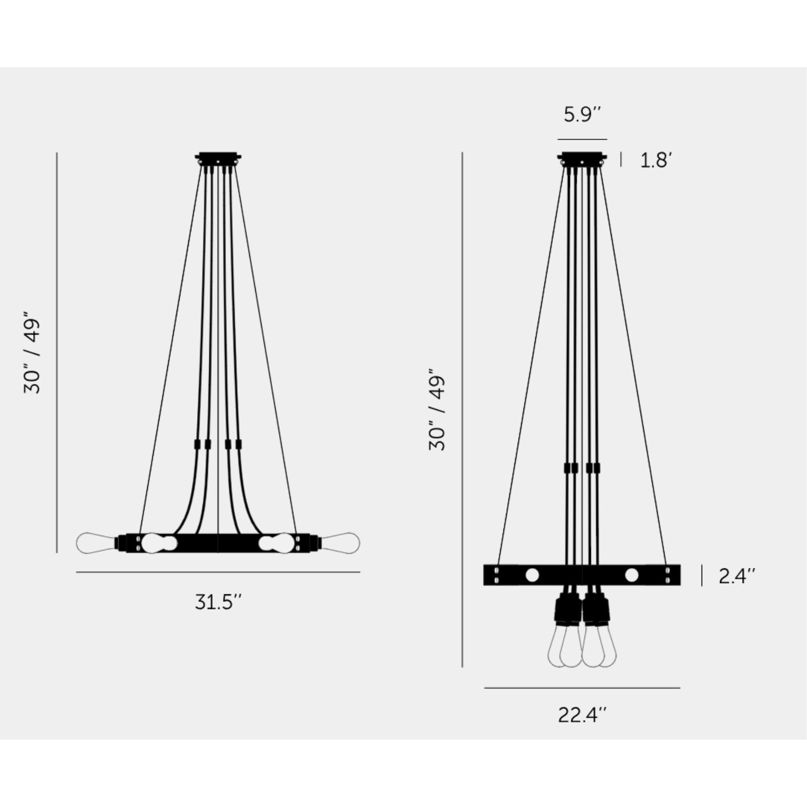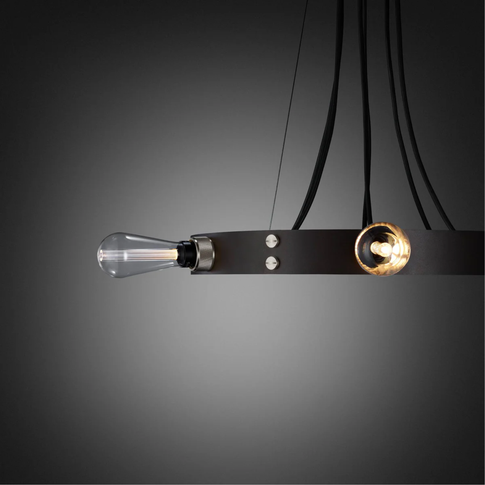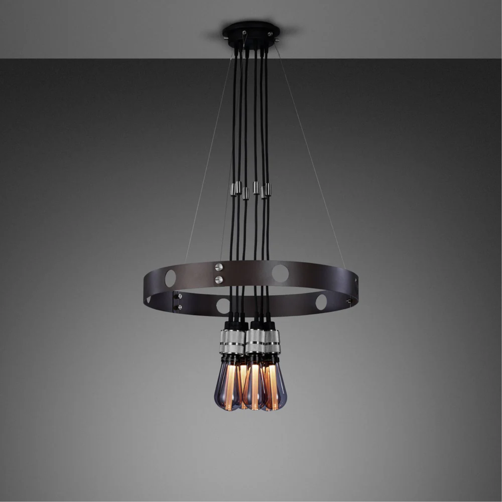 Our HERO light is a chandelier made from a 2mm powder coated metal ring, with solid knurled metal detailing. The light pendants can be set in the ring or left to hang through the centre and can be finished with a choice of our light bulbs.