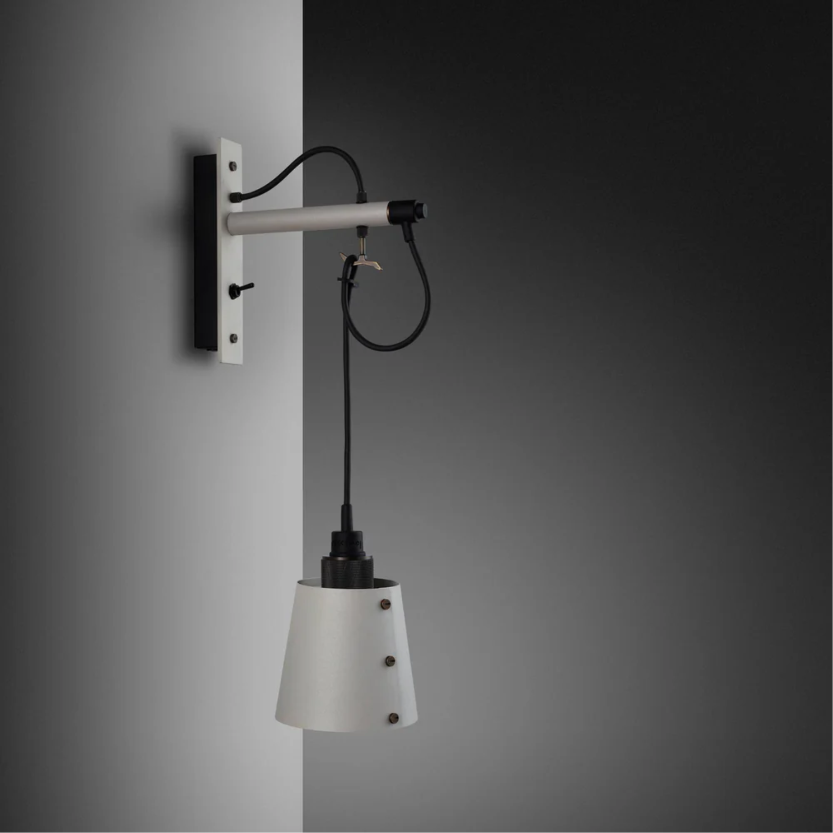 A wall light made from solid metal with matte rubber detailing. The base is finished in either stone or graphite powder coating. The pendant length can be adjusted to suit and hooked onto a solid metal hook. Buster + Punch offers a range of light bulbs that look great with this light and are sold separately.