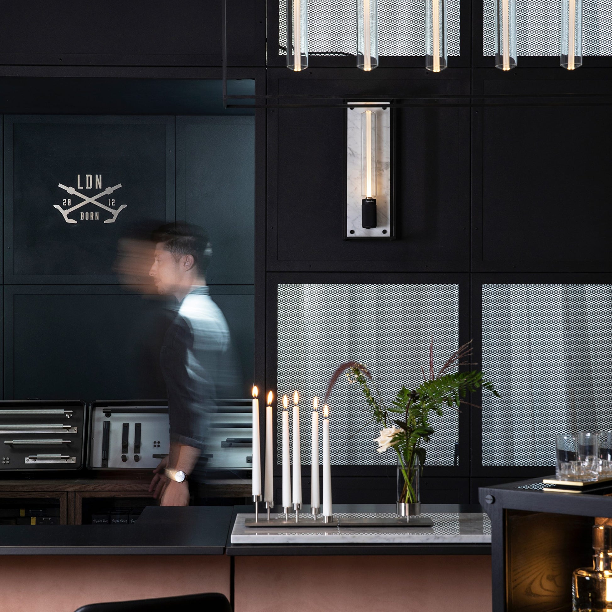 The wall light features a matt black, cross-knurled, lamp holder and our signature coin screws. This light can work on its own or in linear procession for maximum impact.