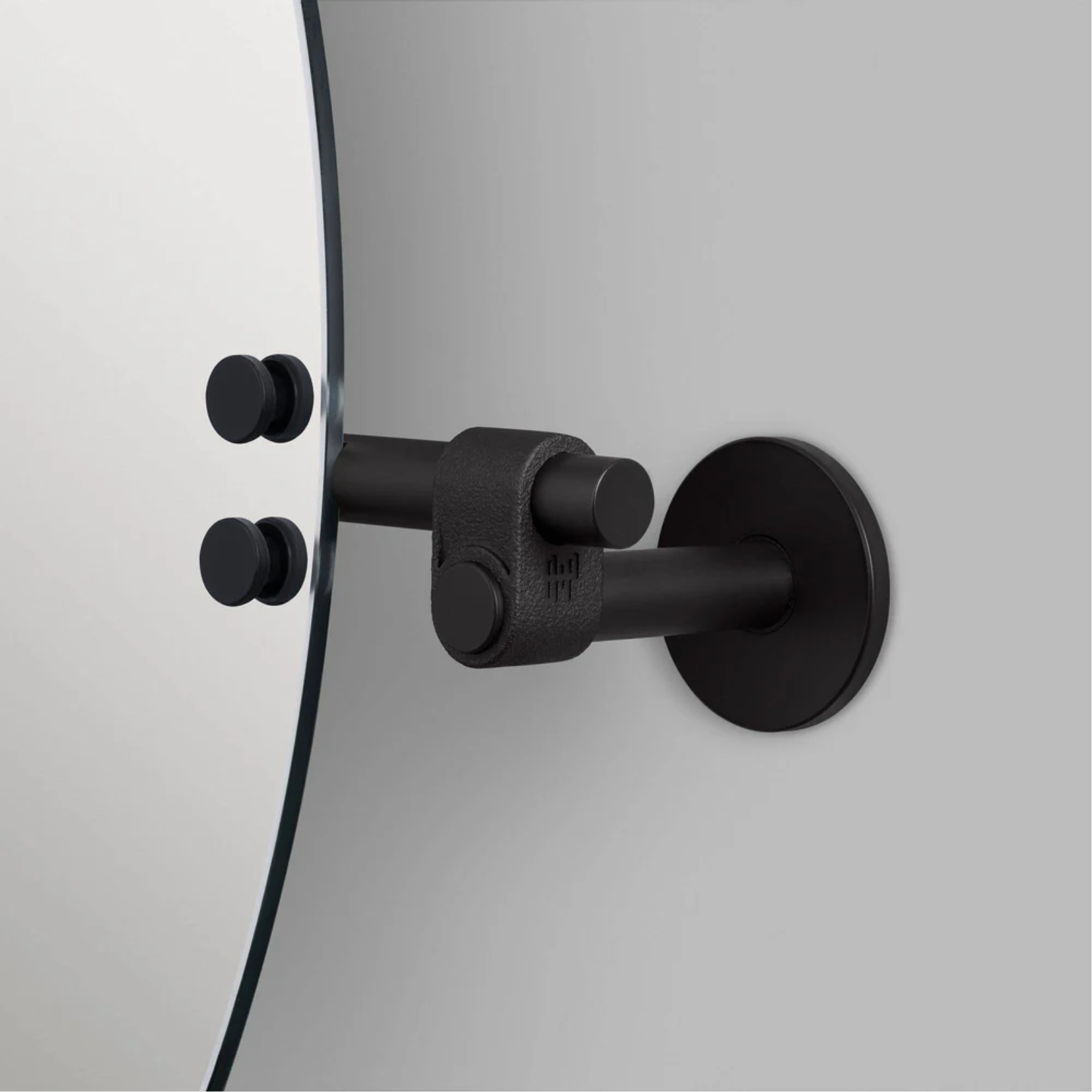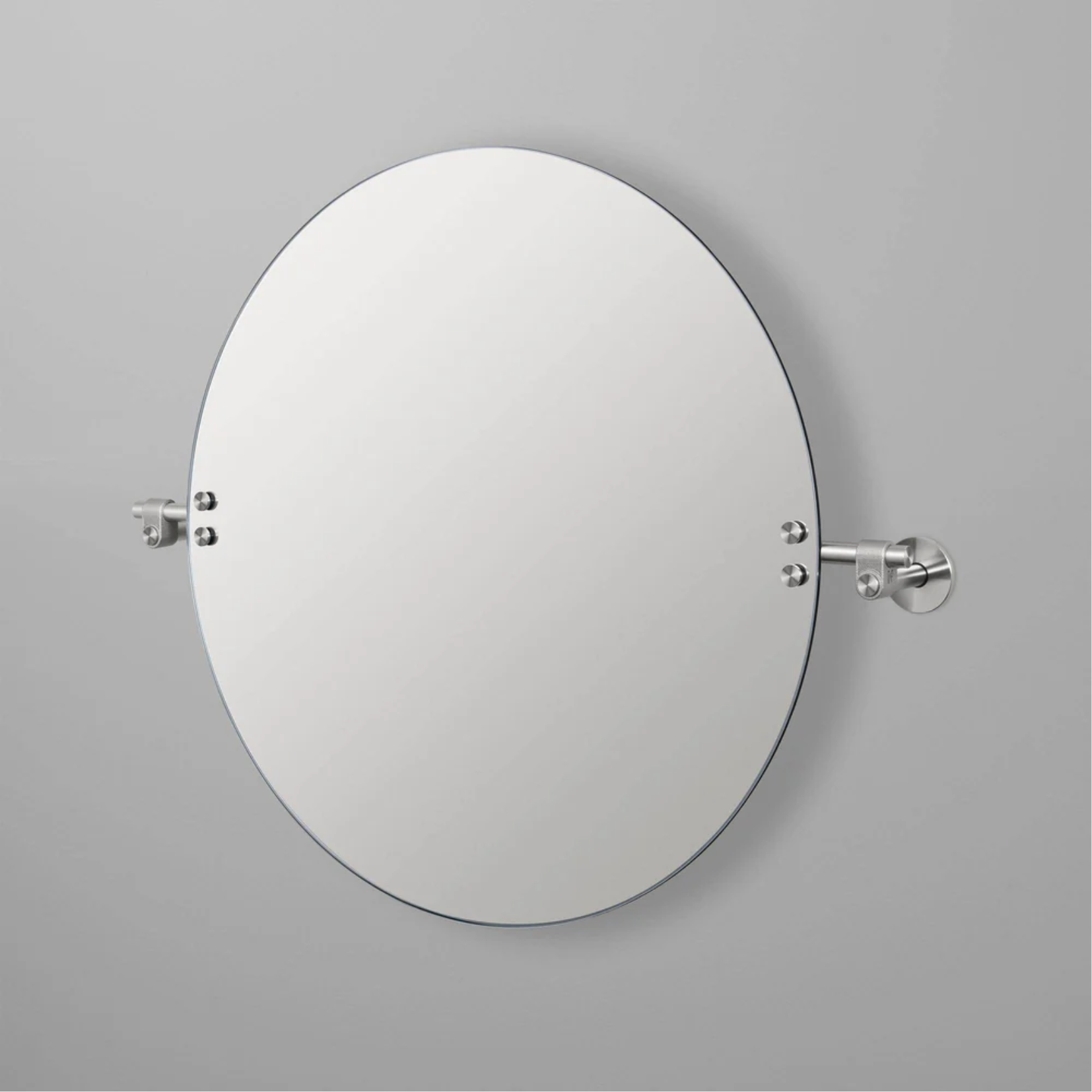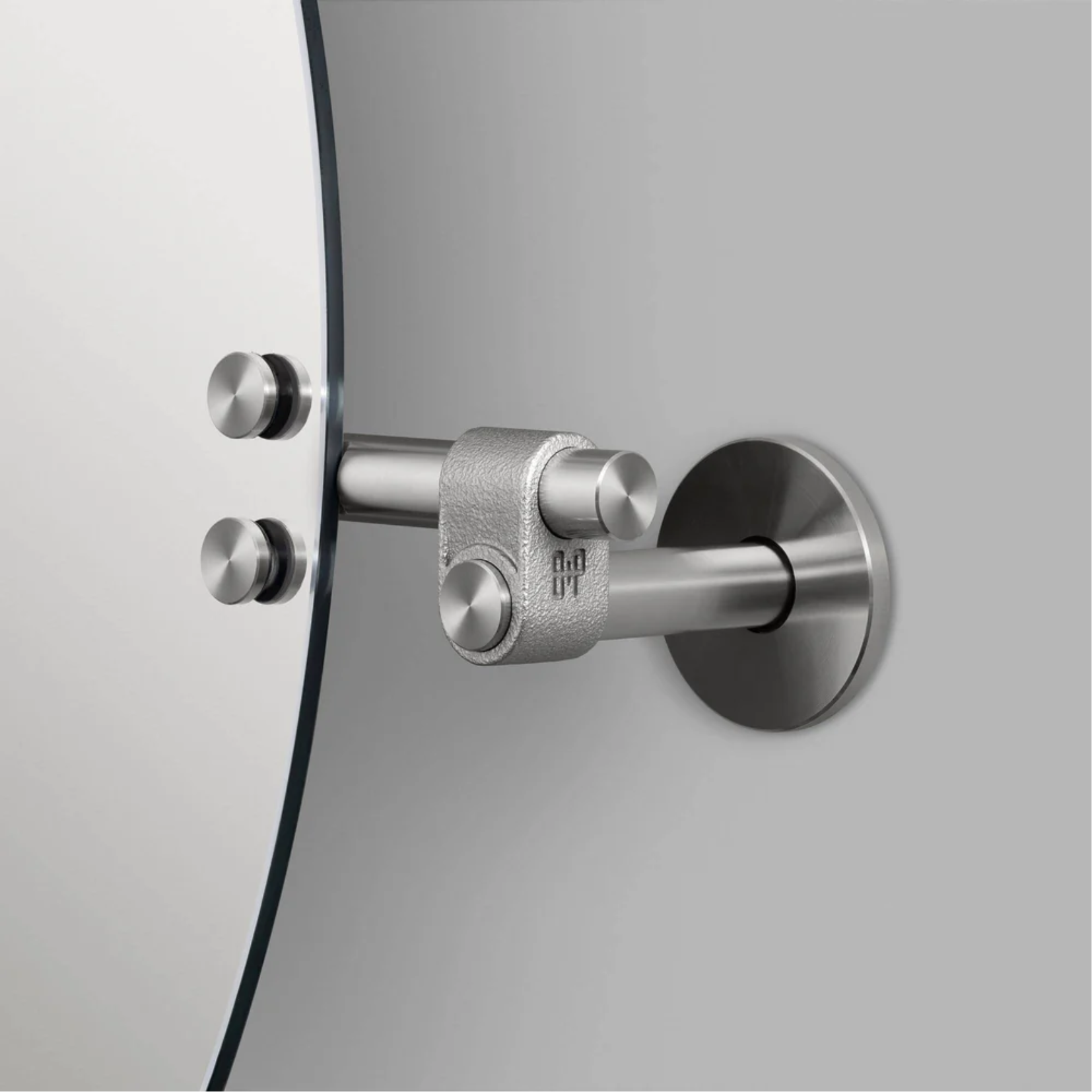 A circular mirror featuring our signature rough-cast knuckle and hand polished metal bar. The mirror can be tilted by hand to adjust to your height. Thanks to the casting process, each knuckle is one-of-a-kind. Suitable for all interior spaces, including bathrooms.