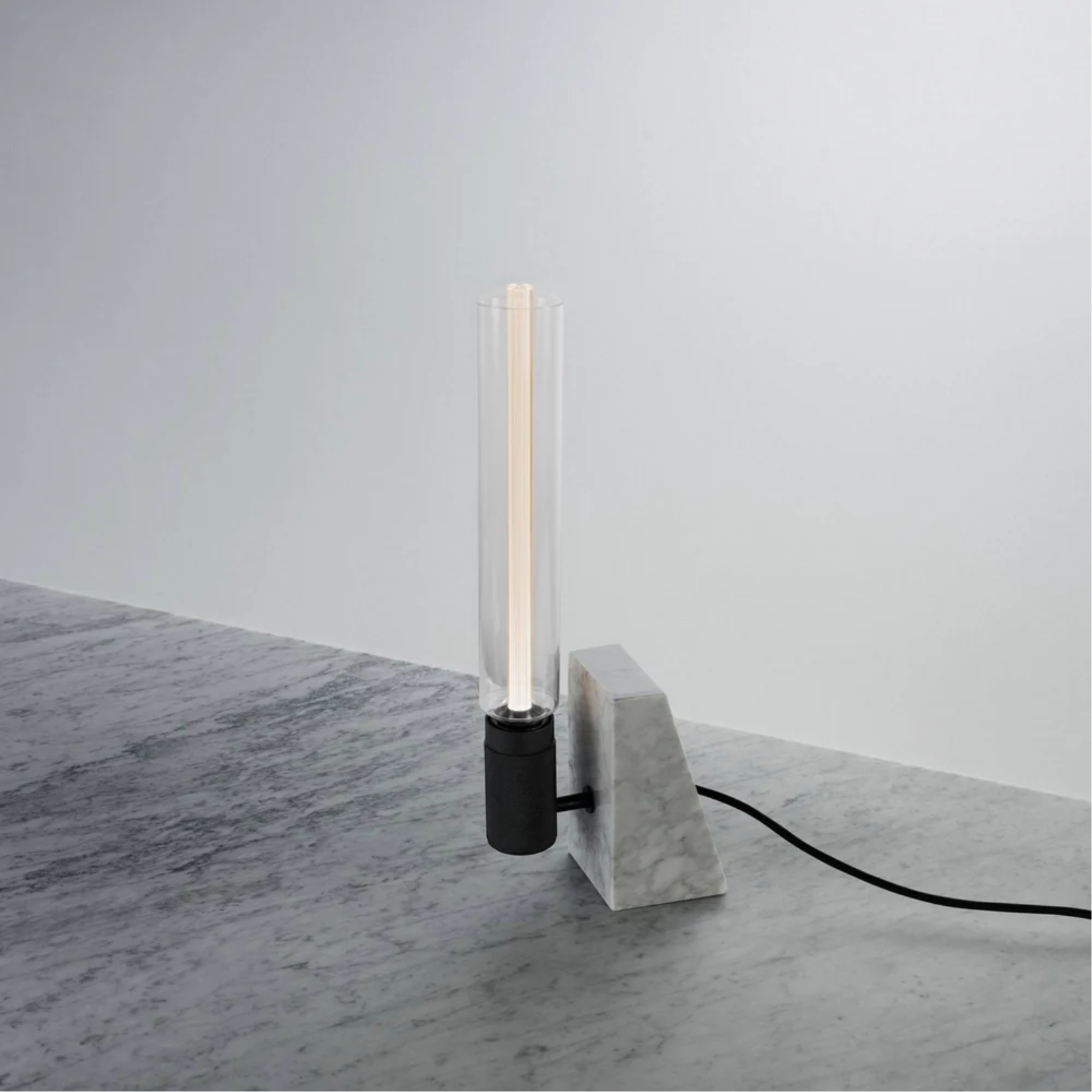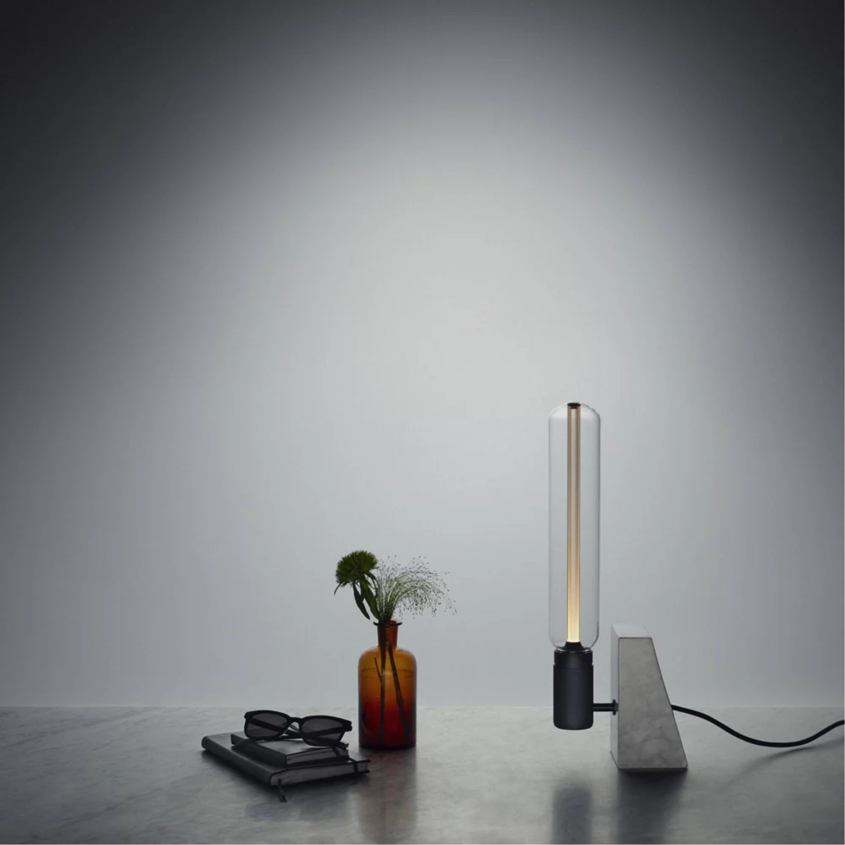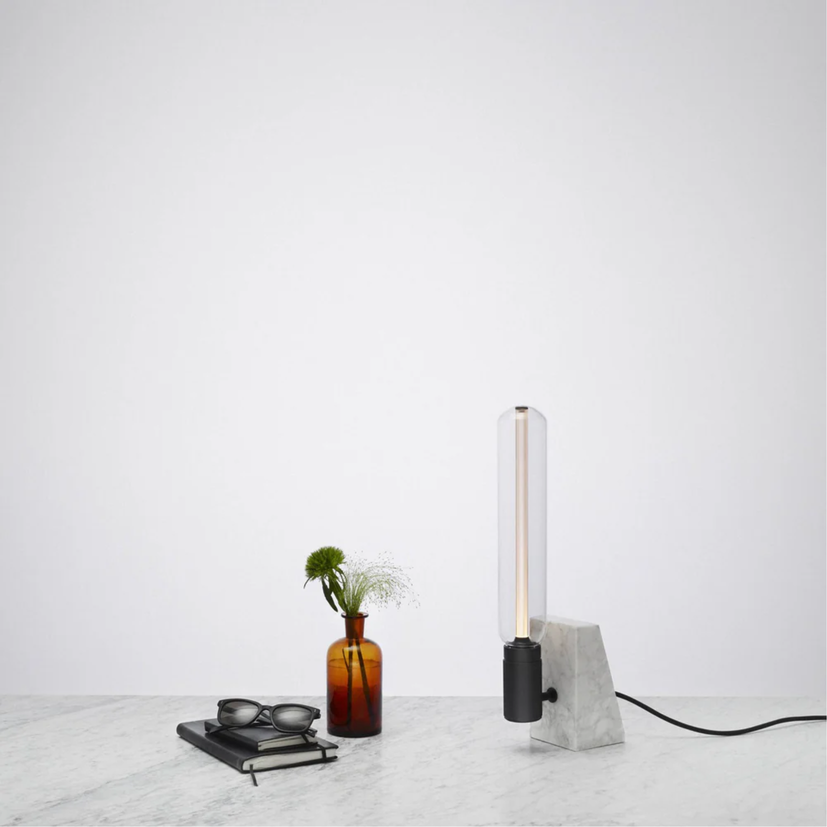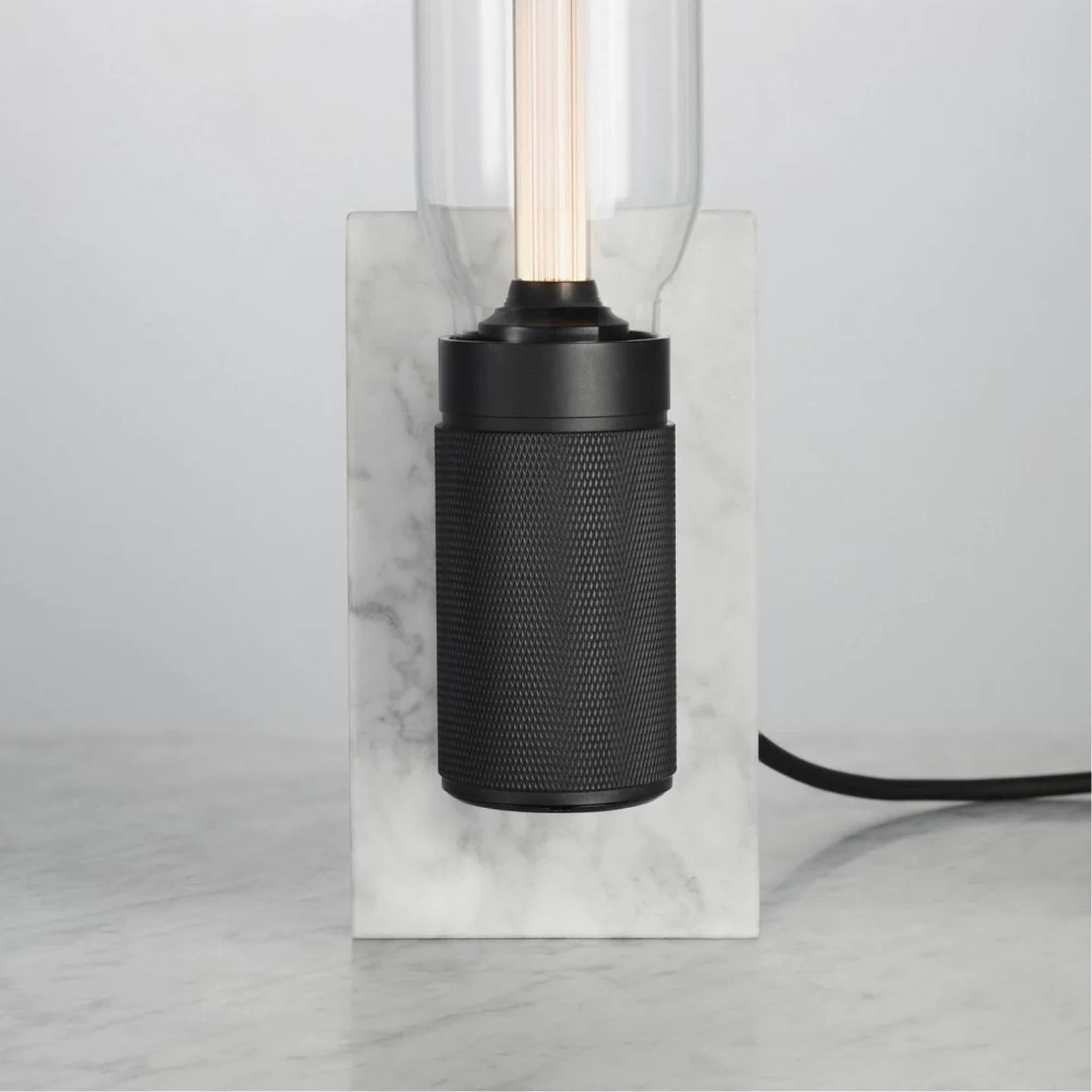 An LED table light made from solid stone with a hand-blown borosilicate glass bulb. Choose between a honed black granite or polished white marble base. The table light is finished with a matte black metal lamp holder and matte black rubber cord and detailing.