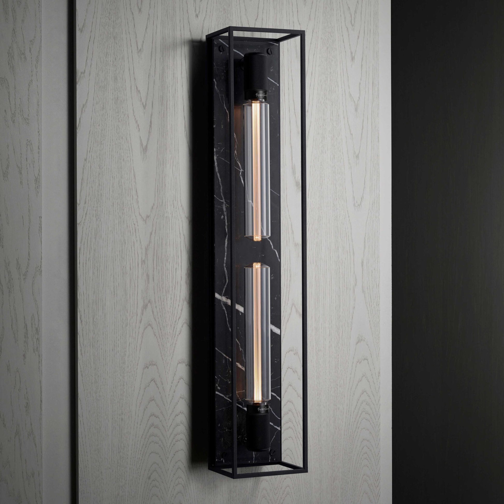 The wall light features matt black, cross-knurled, lamp holders and our signature coin screws. This light can work on it’s own or in linear procession for maximum impact.