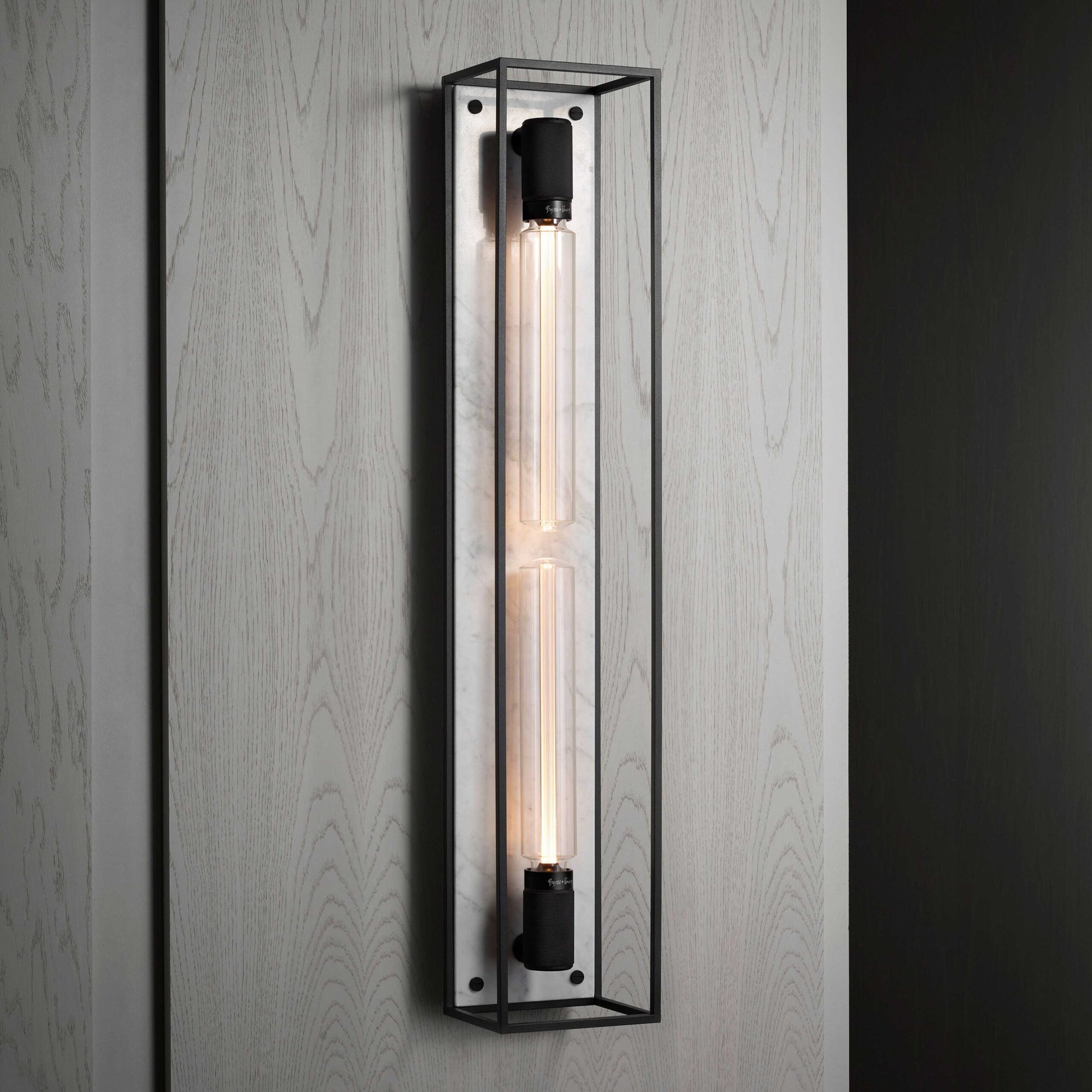 The wall light features matt black, cross-knurled, lamp holders and our signature coin screws. This light can work on it’s own or in linear procession for maximum impact.