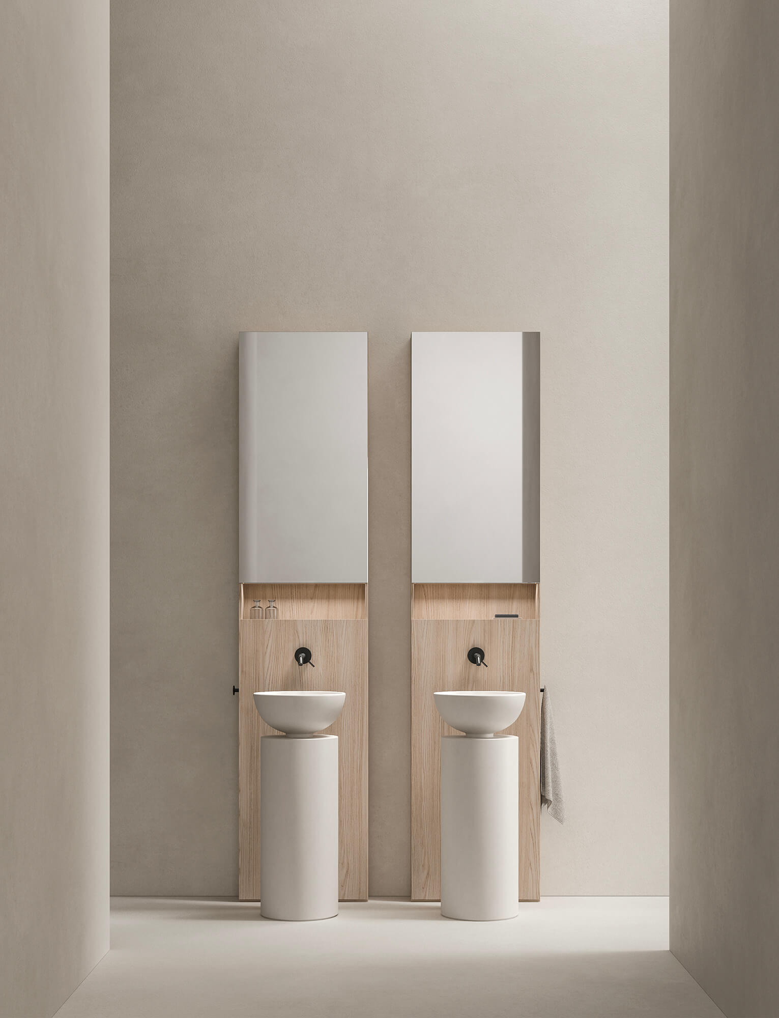 Caba composition composed of column with fixed element for fittings in Venato Sesamo faced panel, open vanity, LED lighting and mirror door W 54 H 238 D 15.3 and two finishing sides. Saba 37 floorstanding washbasin in concrete Caolino. Zeno towel rack accessories in matt black lacquer. Flow L02 faucet in black PVD stainless steel.