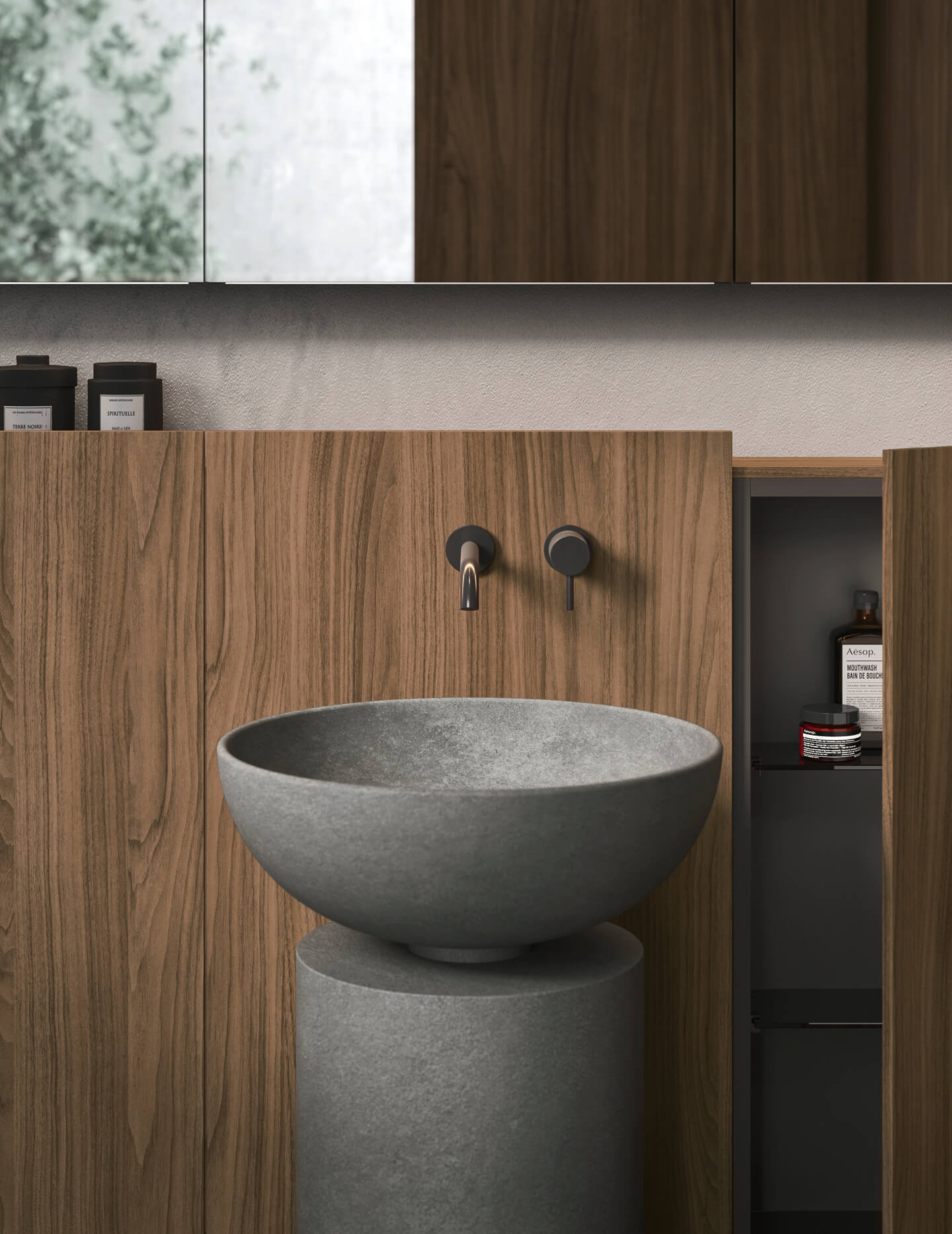 Caba composition W 189 composed of column for toilet, open vanity, LED lighting and mirror door W 90 H custom D 15,3, column with fixed element for fittings, open vanity, LED lighting and mirror door W 54 H custom D 15,3, column with door, open vanity, LED lighting and mirror door W 45 H custom D 15,3 in Venato Cannella faced panel. Saba 45 floor-standing washbasin in Antracite concrete. Accessories Zeno matt black lacquered towel rack and for sanitary ware. Toro series wall hanger in Rovere Carbone. Maki black cork pouf. Senna sanitary ware in matte ceramic. Flow L01 faucet in black PVD steel. Flow W01 flush plate in black PVD steel. Flow shower-head and spout D01 in black PVD steel; thermostatic mixer, diverter and hand shower D03.