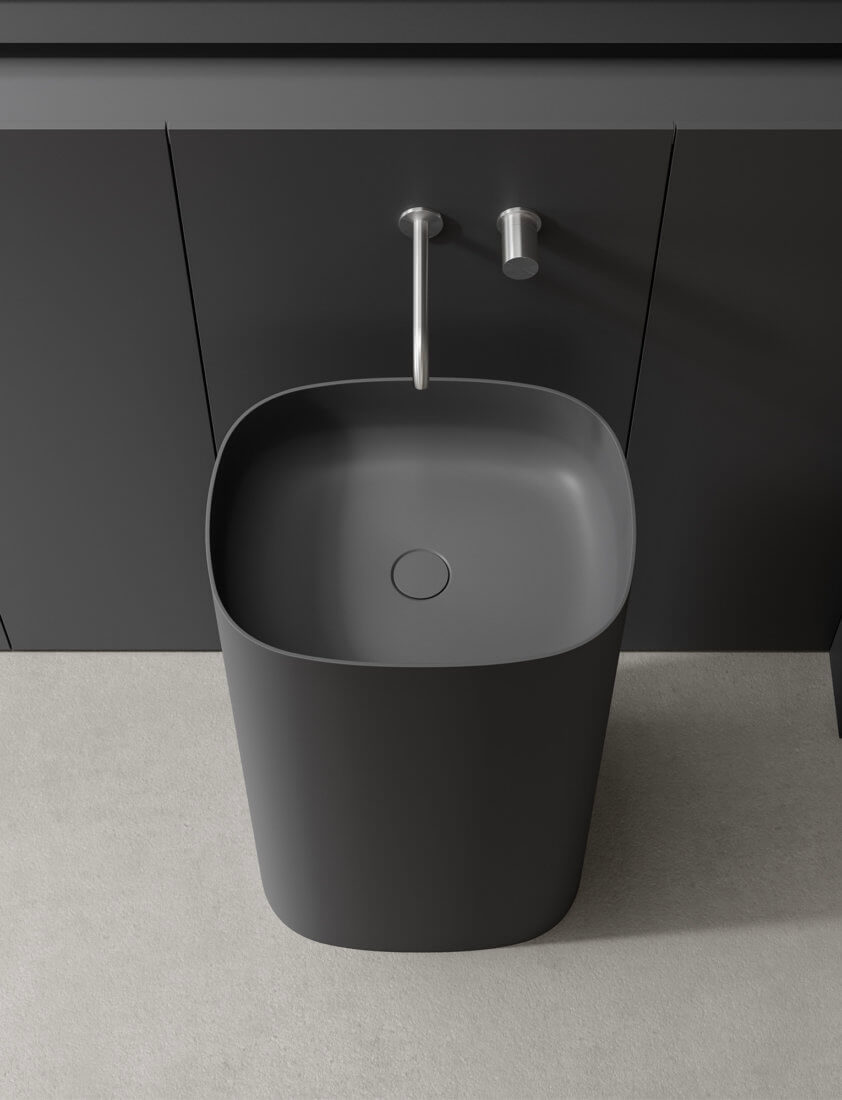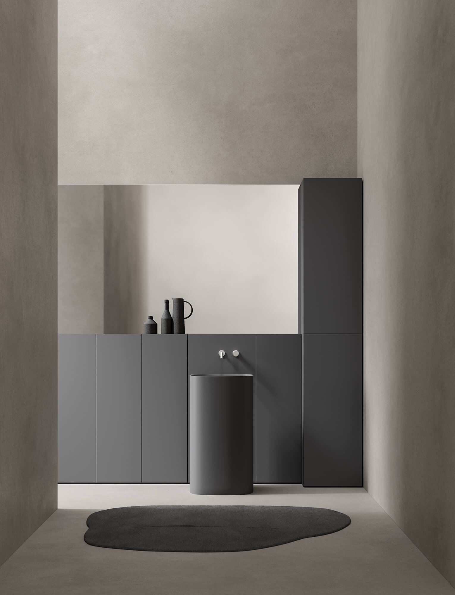 Caba composition W 279 composed of two base units with doors W 72 H 118 D 15,3, one finishing side, one fixed element for fittings W 54 H 118 D 15,3, base unit with door W 36 H 118 D 15,3 in Sillmatt Lavica and column W 45 H 238 D 31,3 with one finishing side in Sillmatt Lavica. Tube 48 floorstanding washbasin in Cristalplant lacquered Sillmatt Lavica. Vetra mirror W 234 H 120 TH 2,8 custom. Flute L01 faucet in satin stainless steel.