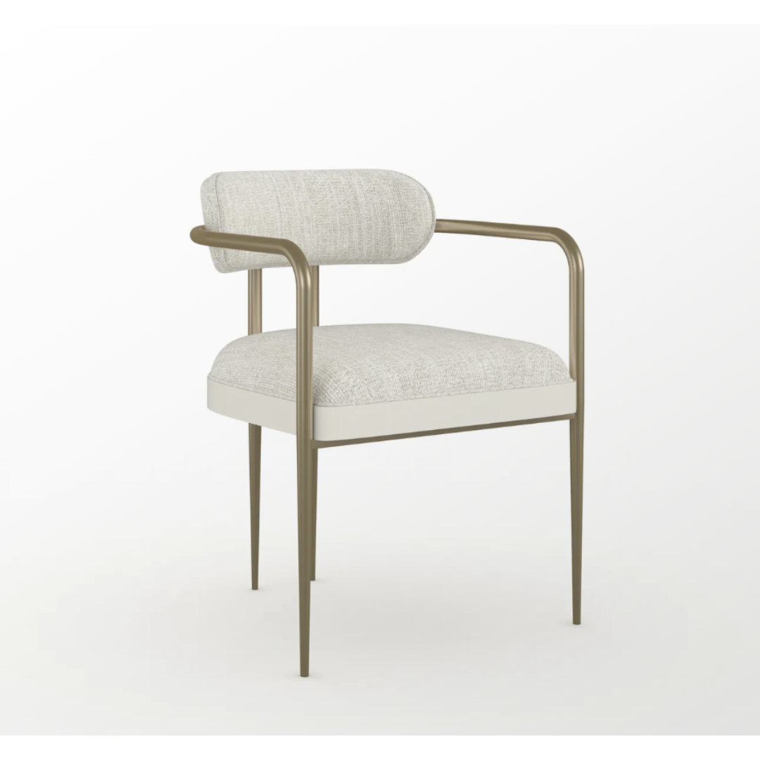 Light in scale with a sinewy silhouette, the Emphasis dining chair draws on parallel lines and an elegance of design to make a statement of modernity. From simplicity, comes sophistication: curved metal arms in Lucent Bronze and a seemingly floating, bowed back and wood-framed seat in a subtly contrasting, Almost White finish.