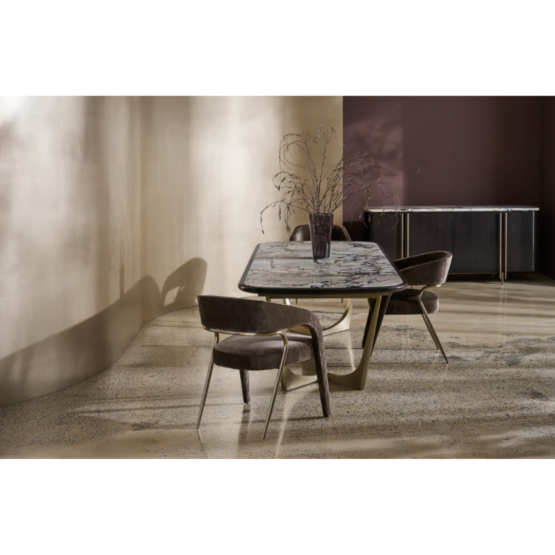 A symbol of grace and beauty, this racy, wrap-around dining chair sports a tight upholstered seat and upholstered open back in sublime Mink Vintage Velvet. Unique to this piece, the upholstered back curves over the arm rests and down the front legs that extend dramatically forward. Contrasting with the soft upholstery are curving rear metal legs in Brushed Gold that stretch backwards, resembling the reach and drive for which the speedy Gazelle is known.