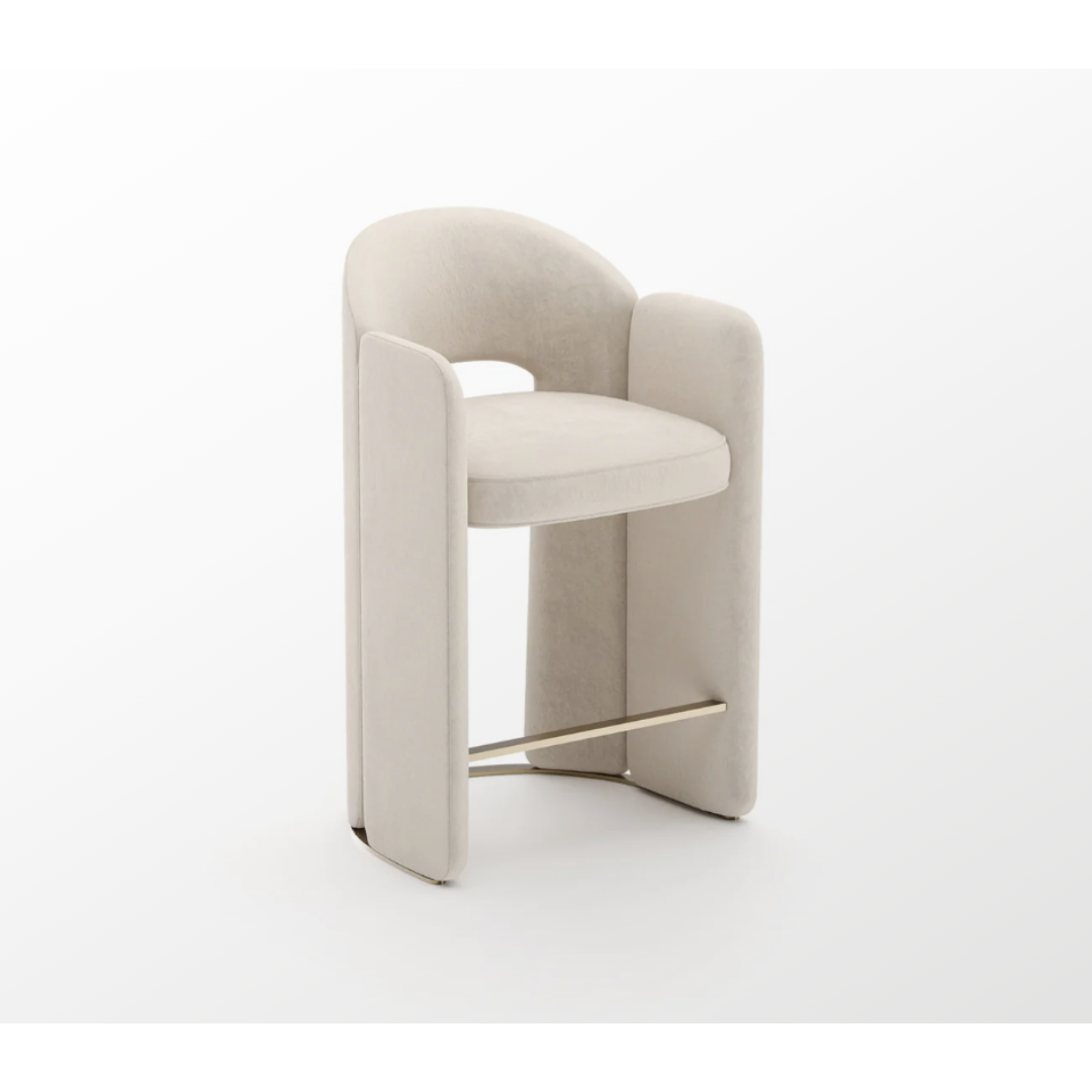 Upholstered in sumptuous Ivory vintage velvet and elegantly detailed with Whisper of Gold metal spline accents, the Overlap Counter Stool Ivory provides refined seating comfort and style for modern kitchen and dining counters.